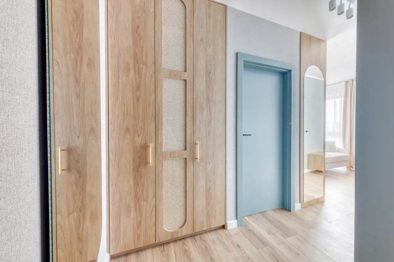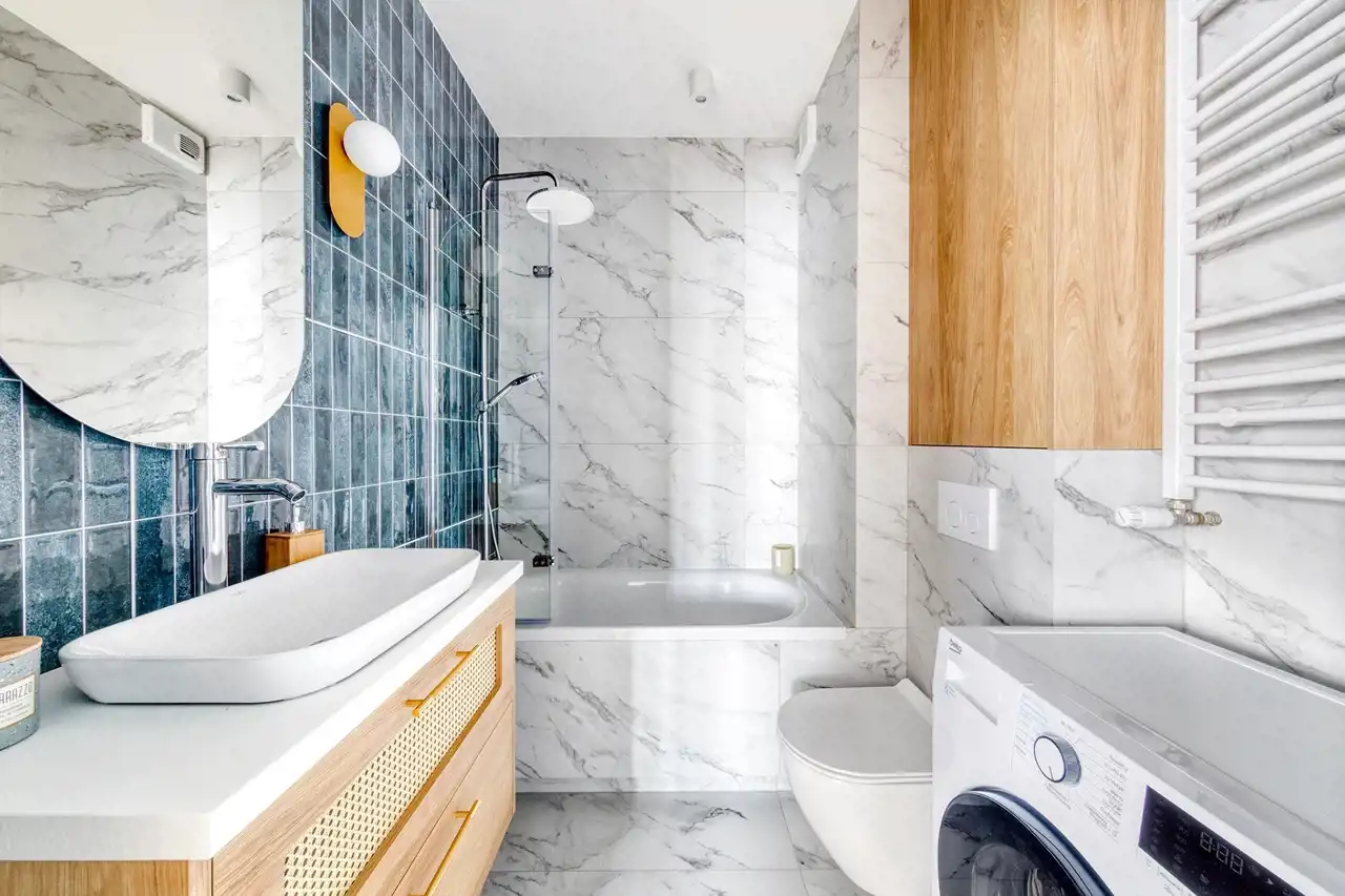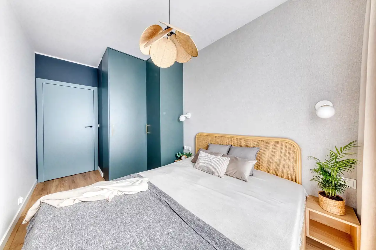 Mieszkanie zostanie wykończone zgodnie z załączoną realizacją w bardzo wysokim standardzie, z dbałością o każdy detal. Wnętrze jest nowoczesne, jasne i harmonijne – dominują naturalne materiały, takie jak drewno i kamień, które nadają przestrzeni przytulnego, a jednocześnie eleganckiego charakteru. Całość tworzy spójny, przemyślany projekt idealny dla osób ceniących estetykę, wygodę i ponadczasowy styl. Kuchnia została zaprojektowana z wykorzystaniem zabudowy meblowej na wymiar, wyposażona jest w wysokiej jakości sprzęt AGD oraz eleganckie blaty z efektem marmuru. Łazienka łączy styl i funkcjonalność – zastosowano tutaj płytki o ciekawym wzorze, designerską armaturę i pojemne szafki. Strefa dzienna z miękką sofą i stonowanymi dodatkami zachwyca ciepłą kolorystyką. Sypialnia z tapicerowanym bezgłowiem i zabudową szaf zapewnia komfort i spokój.
