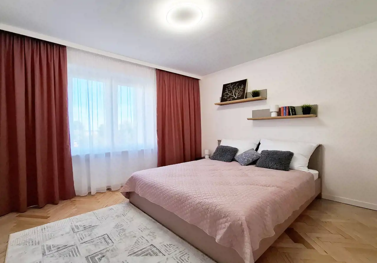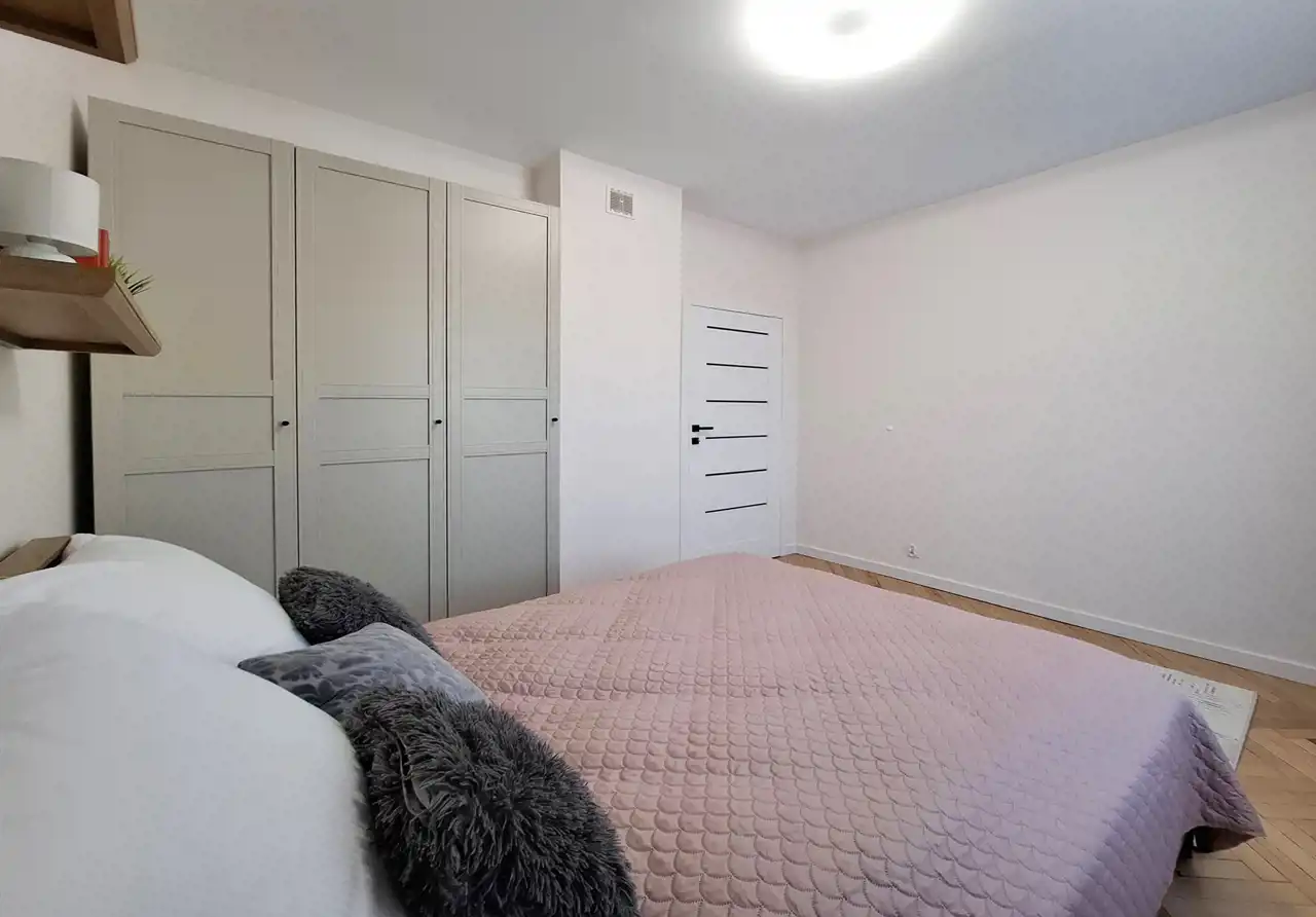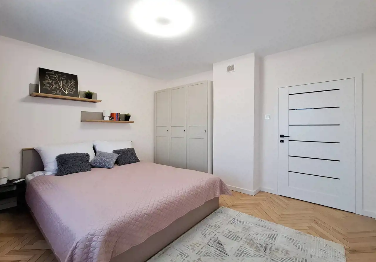 - przytulnej sypialni z dużym łóżkiem, pojemną szafą i biurkiem do pracy,