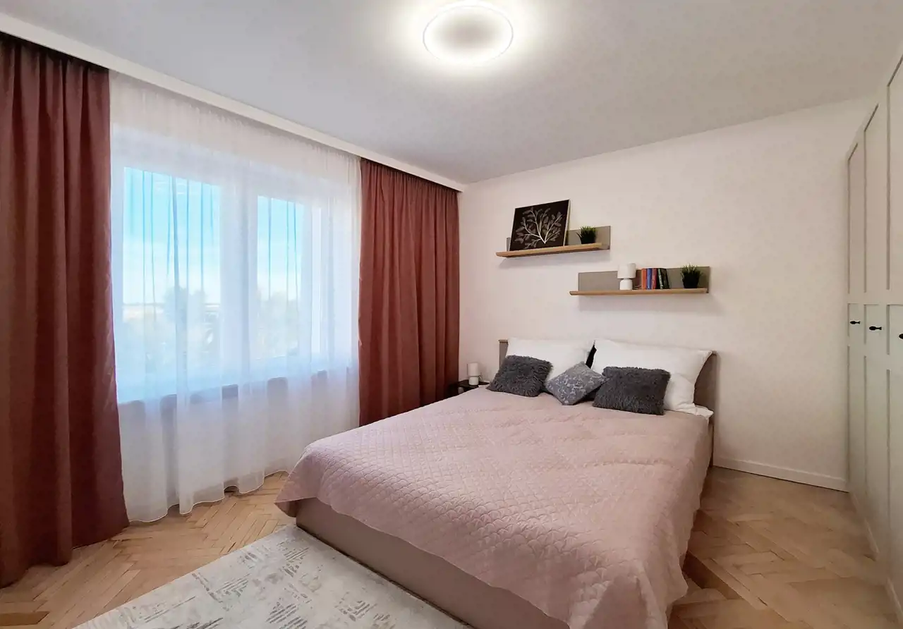 Mieszkanie o powierzchni 46 m² znajduje się na drugim piętrze kameralnego bloku z cegły. Jest świeżo po remoncie i wykończone w wysokim standardzie: