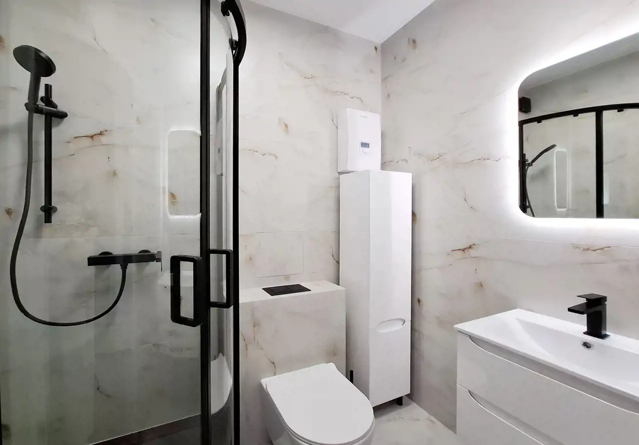 - funkcjonalnej łazienki z prysznicem, pralką i elegancką armaturą,