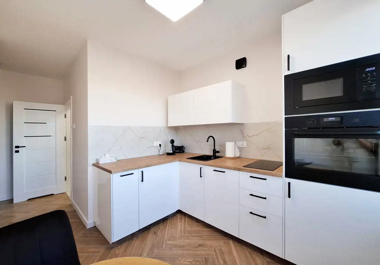 - oddzielnej kuchni z nowoczesną zabudową oraz pełnym wyposażeniem AGD (lodówka, zmywarka, piekarnik, płyta indukcyjna, mikrofalówka, toster, zestaw kuchenny),