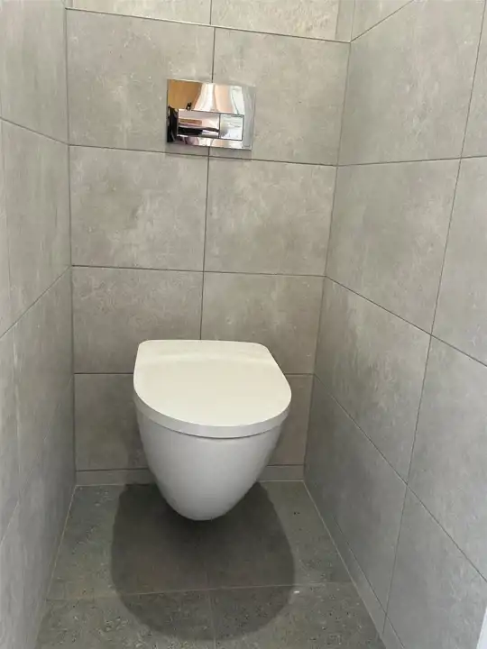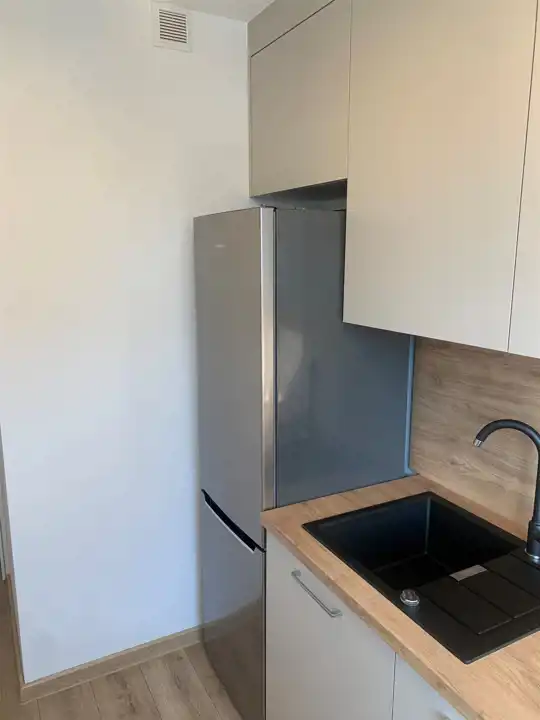 W kuchni, łazience oraz toalecie położono duże jasnoszare i beżowe płytki ceramiczne.