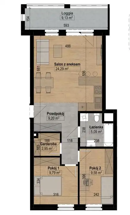 - Charakterystyka mieszkania 63.07 m2, 3 pokoje