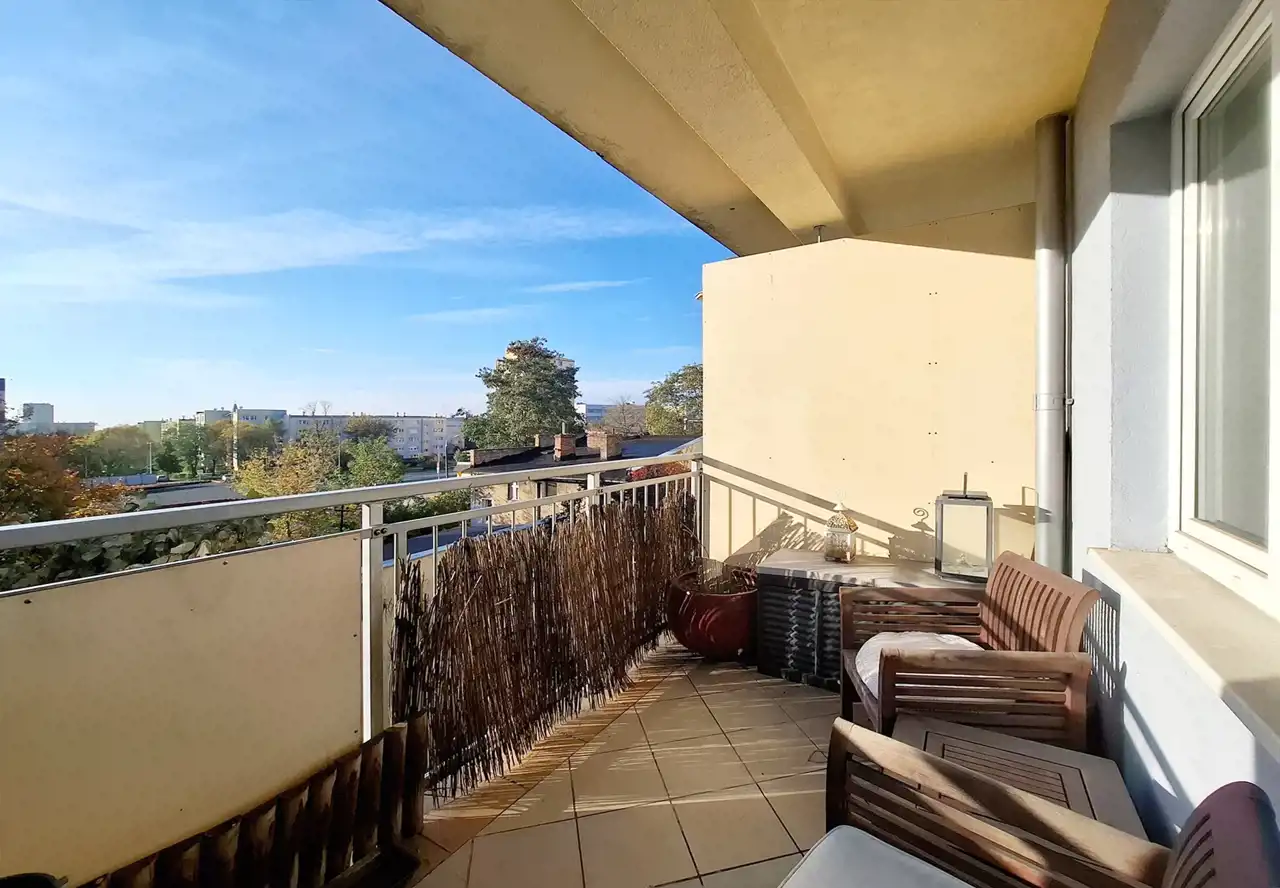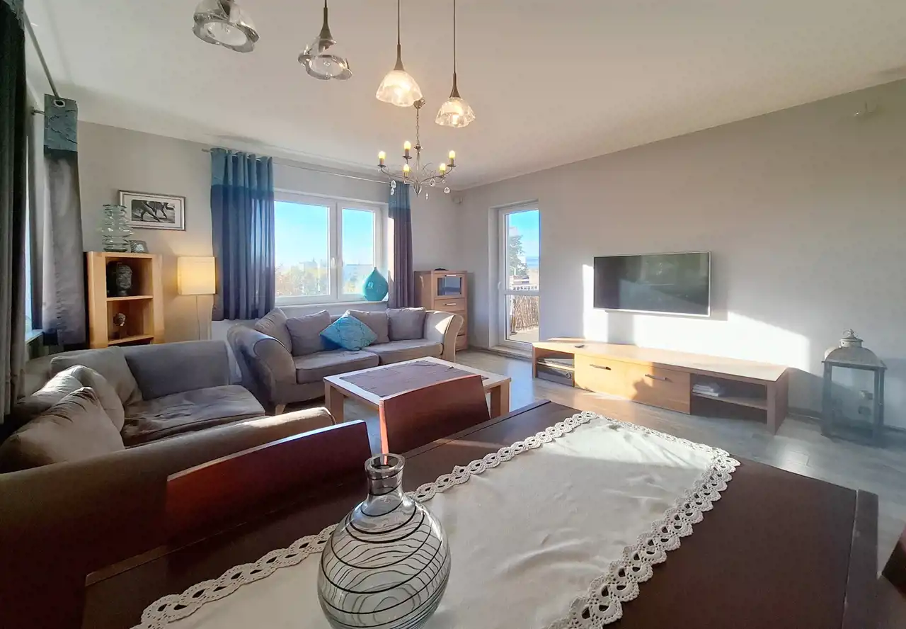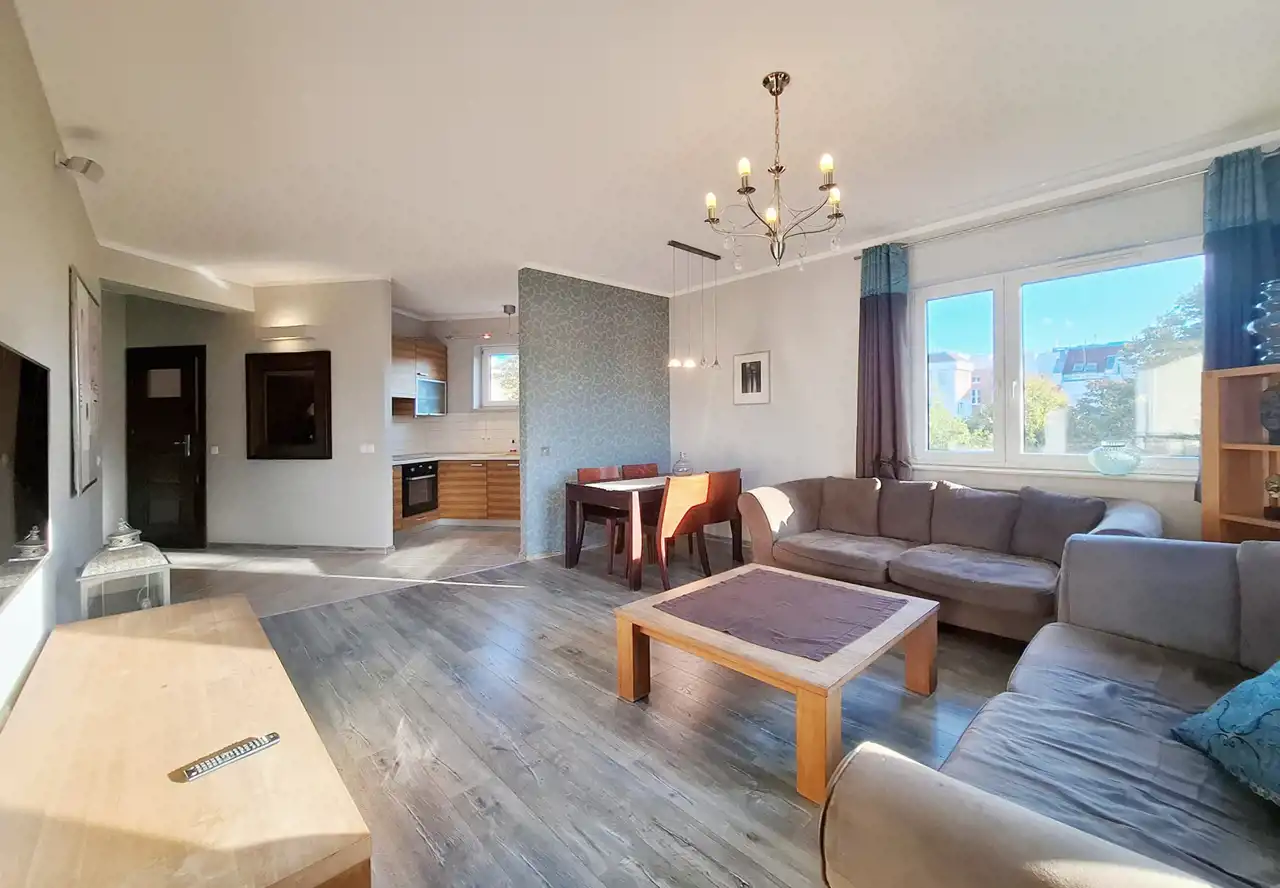 - przestronnego, jasnego salonu z wyjściem na balkon, który jest idealnym miejscem na poranną kawę lub wieczorny relaks.
