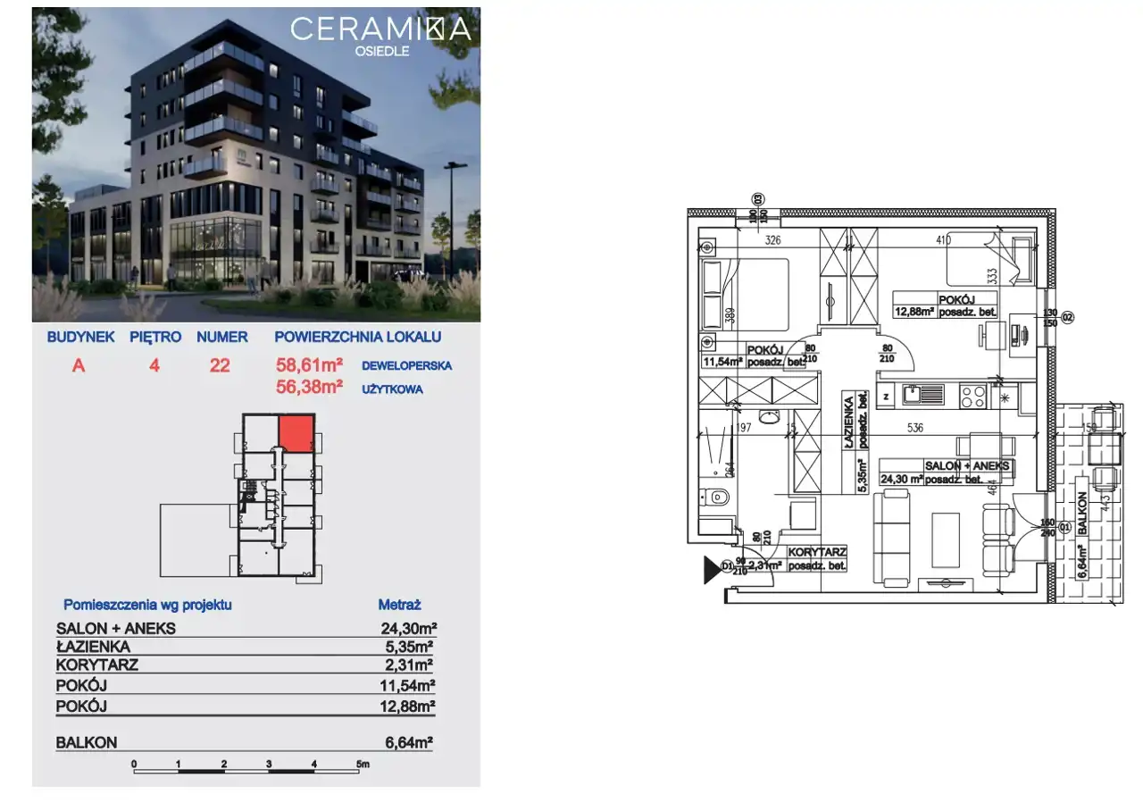 - Charakterystyka mieszkania 56.38 m2, 3 pokoje