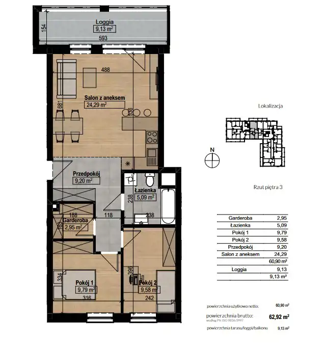 - Charakterystyka mieszkania 63.07 m2, 3 pokoje