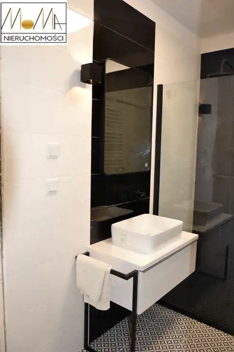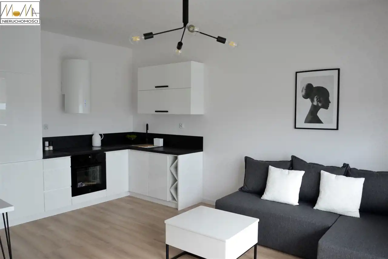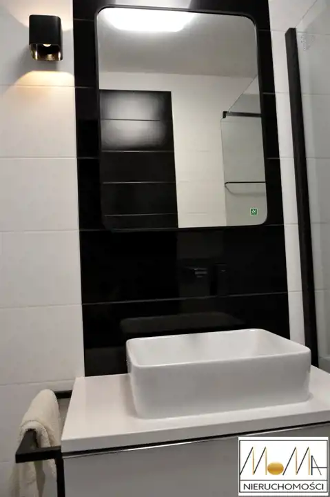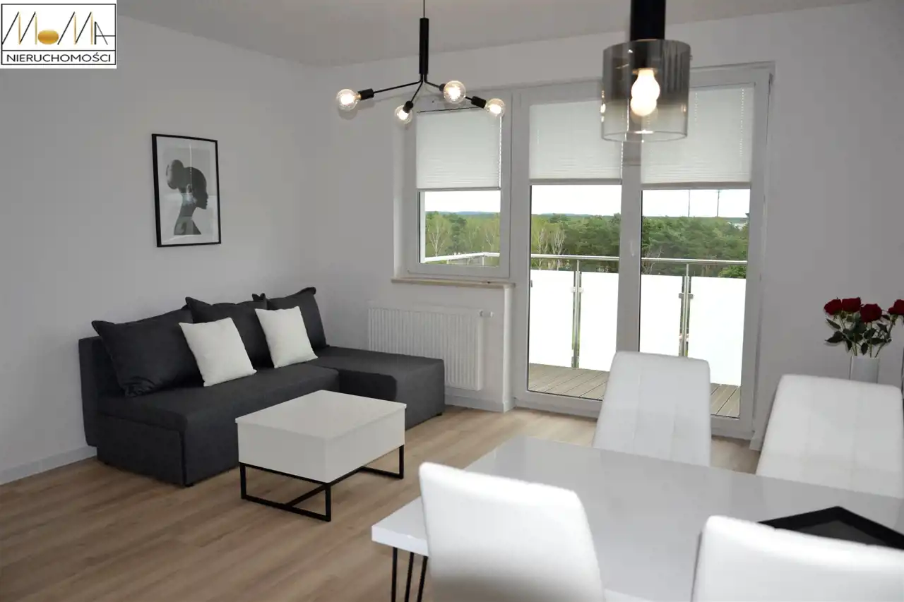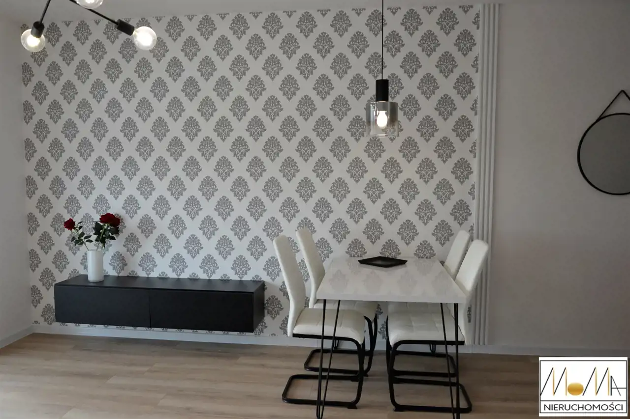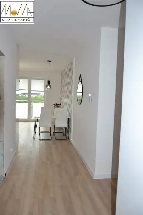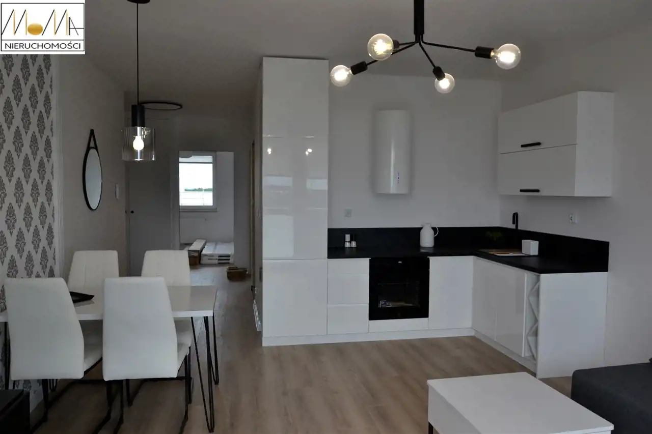 Mieszkanie ma 57,29 m2 i składa się z salonu z aneksem kuchennym 20,6 m2, sypialni 12 m2, pokoju 12 m2, łazienki 4,5 m2 i korytarza oraz balkonu 4,5 m2. Gustownie urządzona kuchnia w kolorze białym z czarnym blatem wyposażona jest w sprzęt AGD (piekarnik, płyta indukcyjna, okap kuchenny, lodówka, zmywarka) doskonale komponuje się z otwartym salonem co tworzy przytulne nowoczesne wnętrze. Nowoczesna łazienka wyposażona jest w prysznic z czarną baterią z deszczownicą. Podłogi w mieszkaniu są w jednolitym drewnianym kolorze. Mieszkanie znajduje się w nowopowstałym (2022r.) budynku z cichobieżną windą z poziomu garażu, w bliskiej odległości sklepy, szkoły, przedszkola oraz komunikacja miejska, szpital, dworzec.