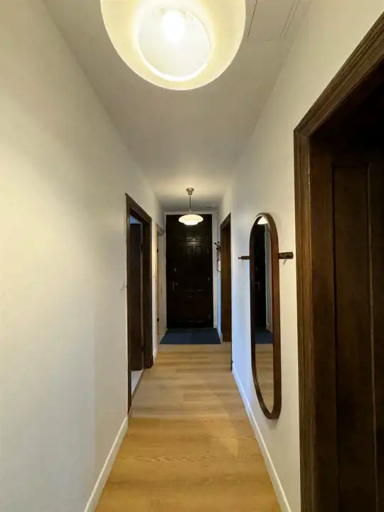 Mieszkanie składa się z trzech pokoi, jasnej kuchni, łazienki, pralni, przedpokoju i piwnicy.