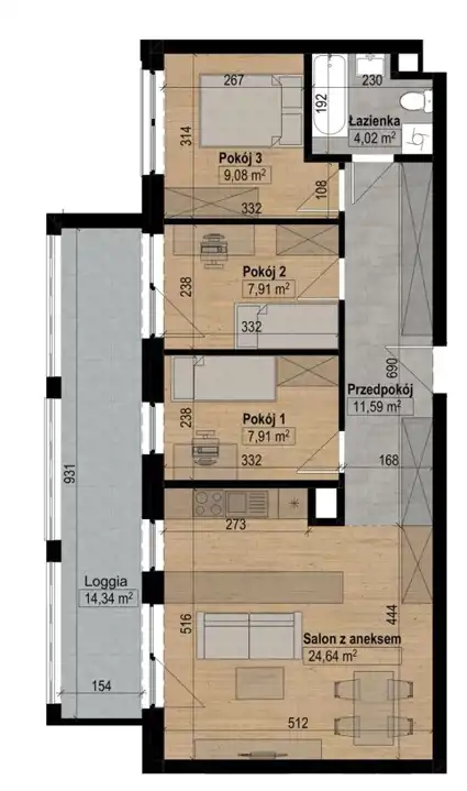- Charakterystyka mieszkania 67.42 m2, 4 pokoje