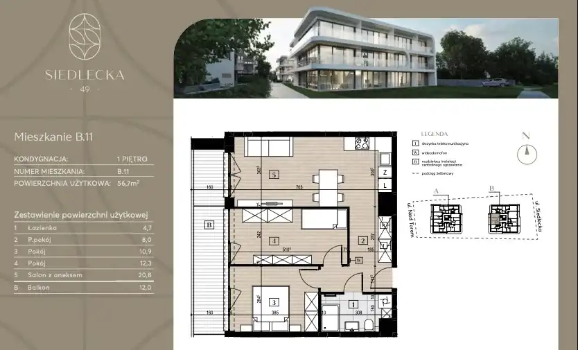 Mieszkanie o powierzchni 56,7 m2 składa się z :