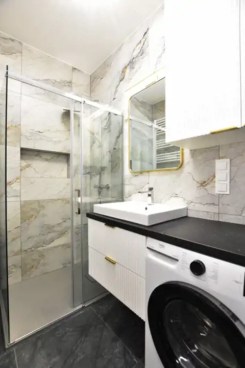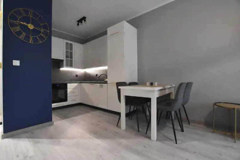W cenie pozostaje: zabudowa kuchenna ze sprzętem AGD , armatura łazienkowa, szafy.