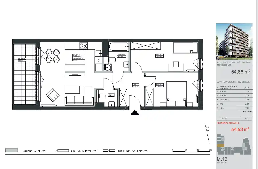 - Charakterystyka mieszkania 64.63 m2, 3 pokoje