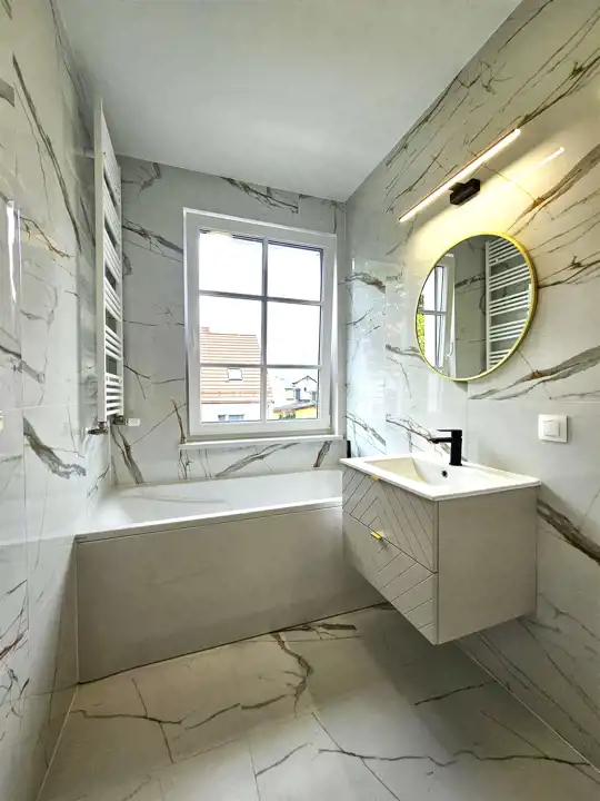 łazienka - wanna, umywalka z szafką podwieszaną, lustro, oświetlenie