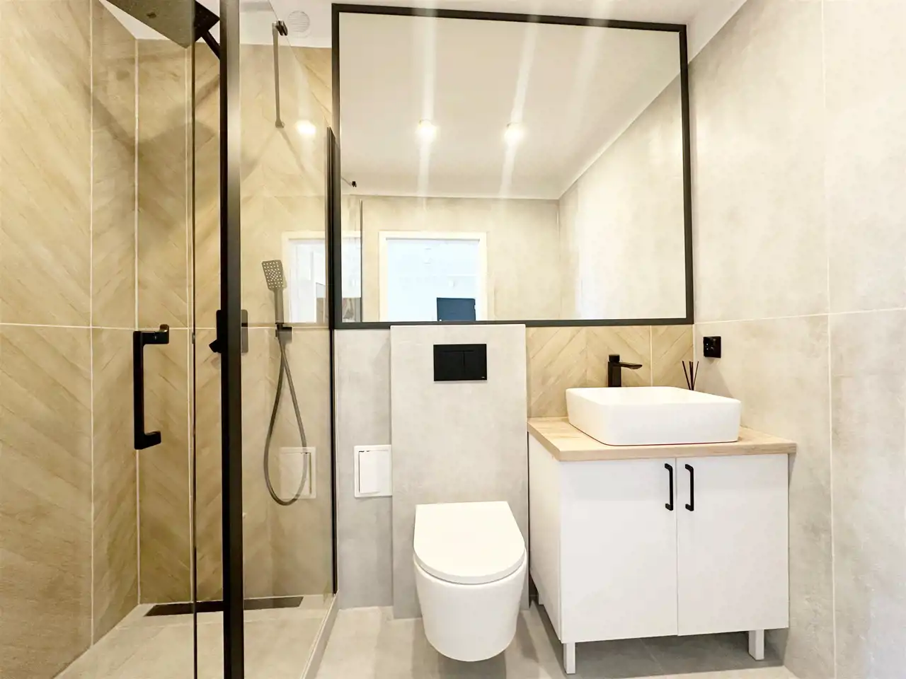 - duży salon z aneksem kuchennym (nowa zabudowa i sprzęty)