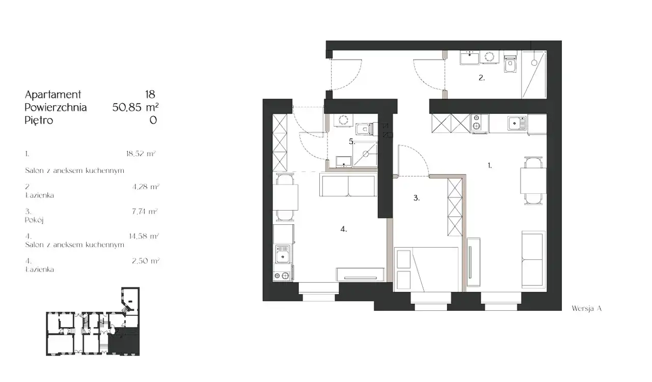 Każde z własną łazienką i kuchnią. Łączna powierzchnia 50,85 m2, parter.