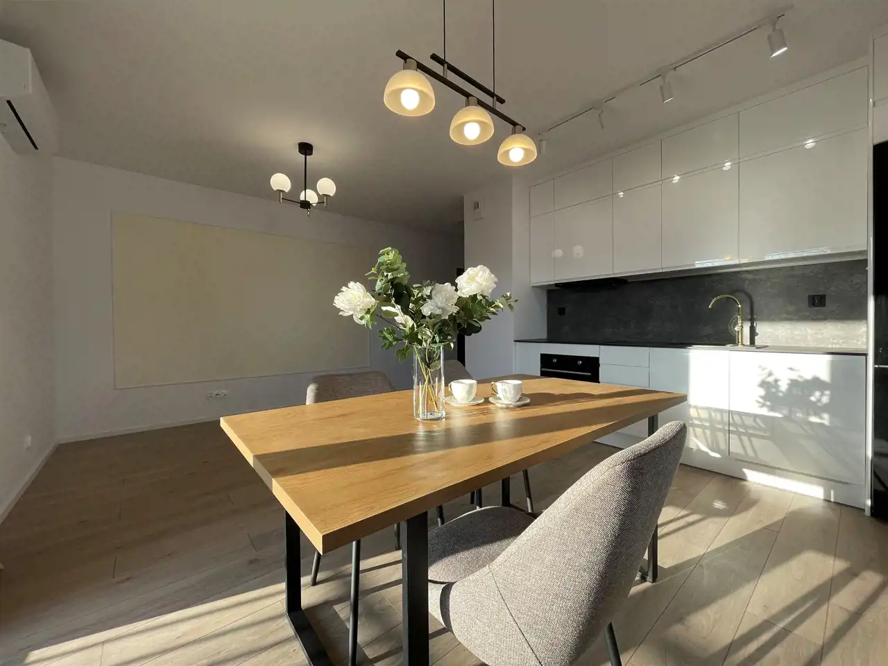 - przestronny salon z aneksem kuchennym,