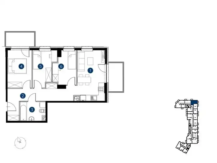 Układ składa się z salonu z kuchnią, trzech sypialni, przedpokoju i łazienki.