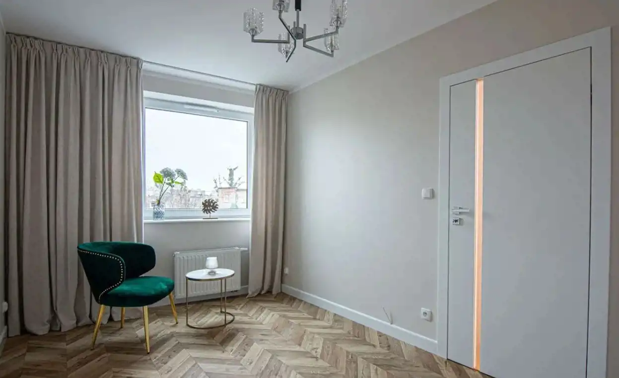 Wyszukane oświetlenie, wysokiej klasy blaty, stylowy stół z czterema krzesłami, piękne zasłony, nowoczesna stolarka drzwiowa, na podłodze jodełka, stylowe lakierowane wysokie listwy przypodłogowe. Wszystkie elementy idealnie są ze sobą skomponowane, nadając wnętrzu niepowtarzalny wygląd.