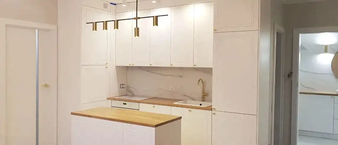 Aneks kuchenny wyposażony w przepiękną lakierowaną frezowaną białą zabudowę z wbudowanym nowym sprzętem AGD (piekarnik elektryczny, płyta indukcyjna, okap), wyspa.