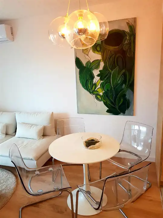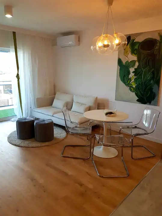 - pokój dzienny umeblowany: stół z krzesłami, wygodna kanapa, stolik RTV