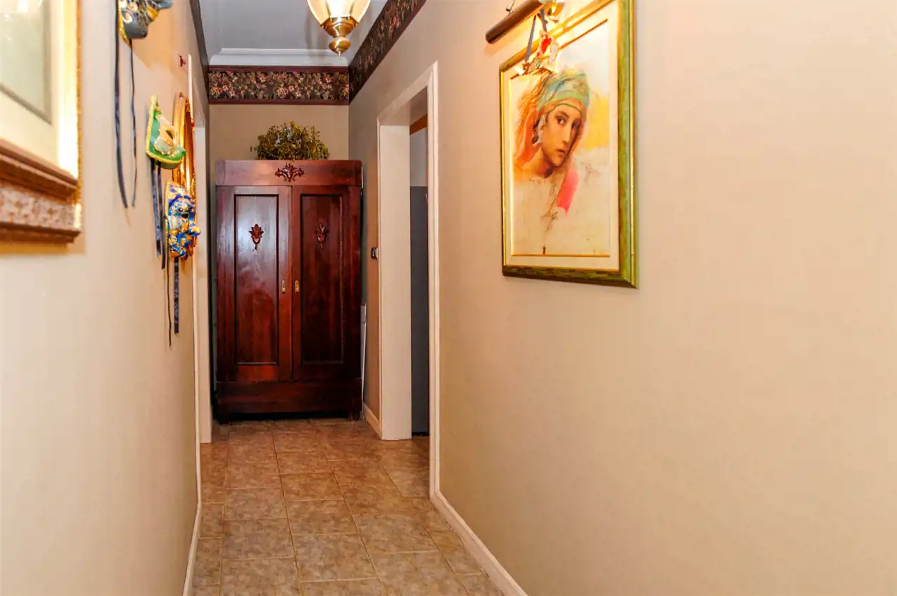 Przedpokój z wnęką na szafę. Na podłogach kafle.