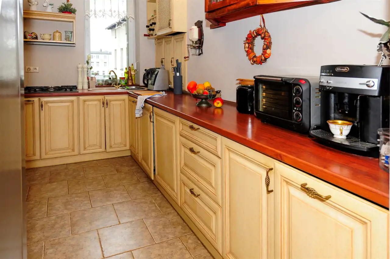 Piękna i jednocześnie bardzo funkcjonalna kuchnia będzie doskonałym miejscem do gotowania dla całej rodziny. Bez żadnych trudności przygotujesz posiłki i pochowasz naczynia. Sprzęty AGD z wyjątkiem lodówki pozostają do dyspozycji klienta. Nawet spora rodzina zje z przyjemnością rodzinny obiad przy dużym stole w jadalni. Jest to duży atut zwłaszcza kiedy jest potrzeba organizacji przyjęć dla większej ilości osób. Swoboda i przestrzeń, którą czuje się w tym mieszkaniu przypadnie do gustu osobom nie lubiącym typowych, niewielkich mieszkań w blokowiskach.