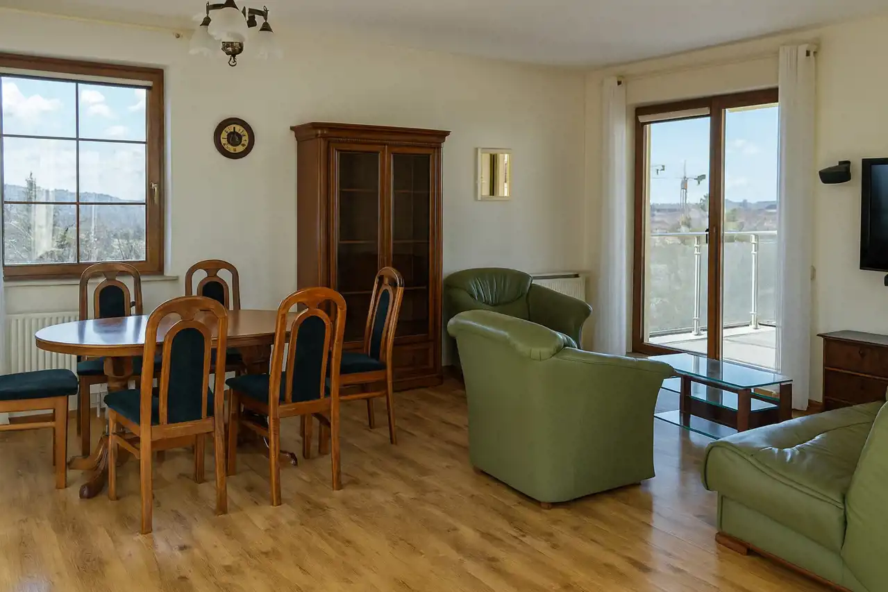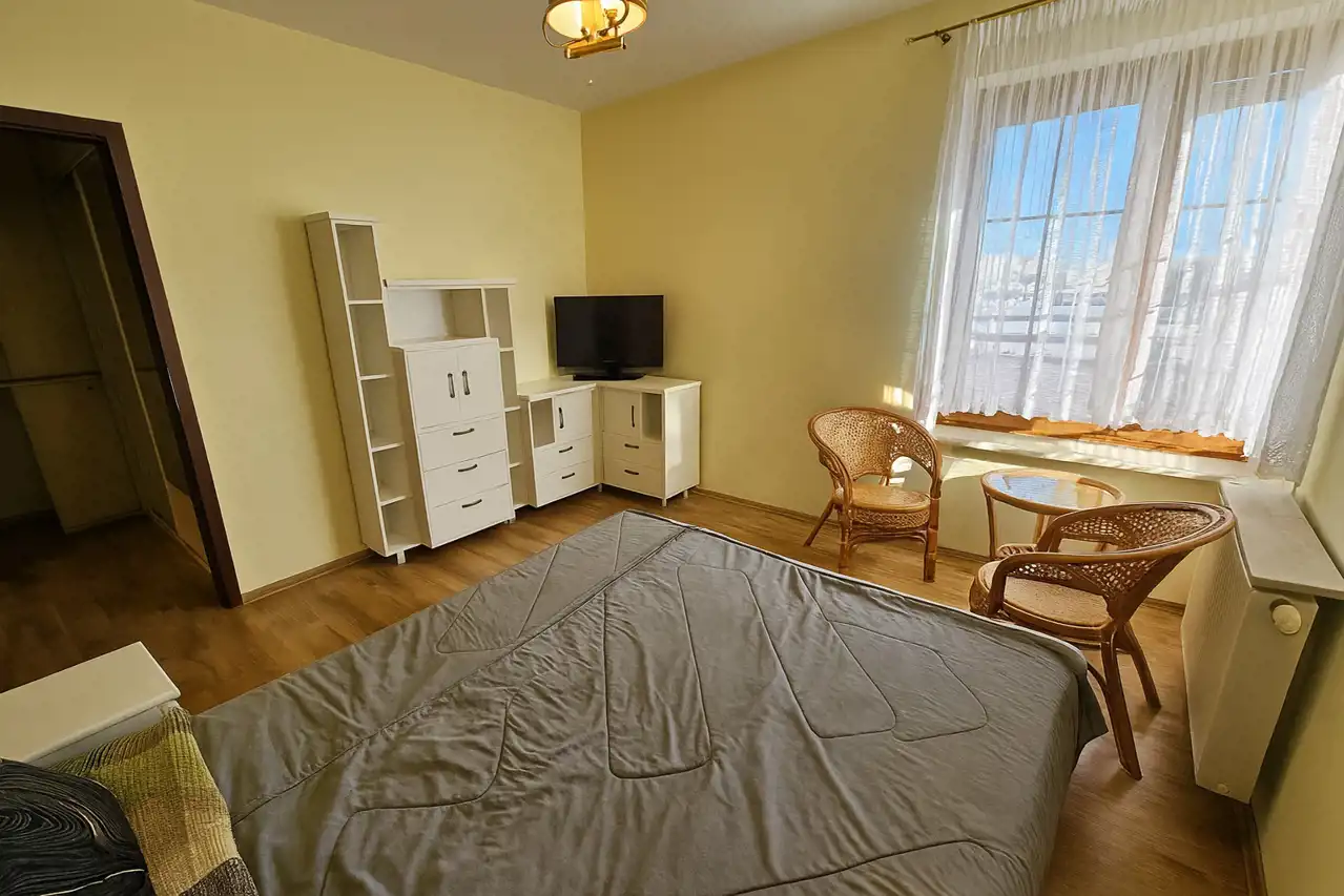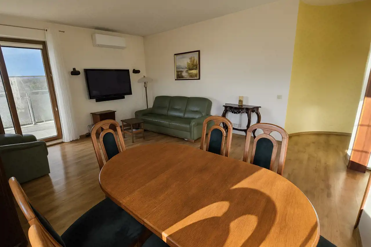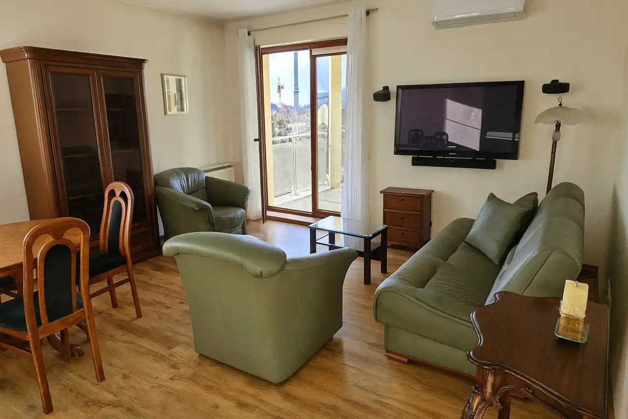 Jasny i ustawny, z dużymi oknami i wyjściem na taras; na wyposażeniu meble, nowa klimatyzacja oraz telewizor. -