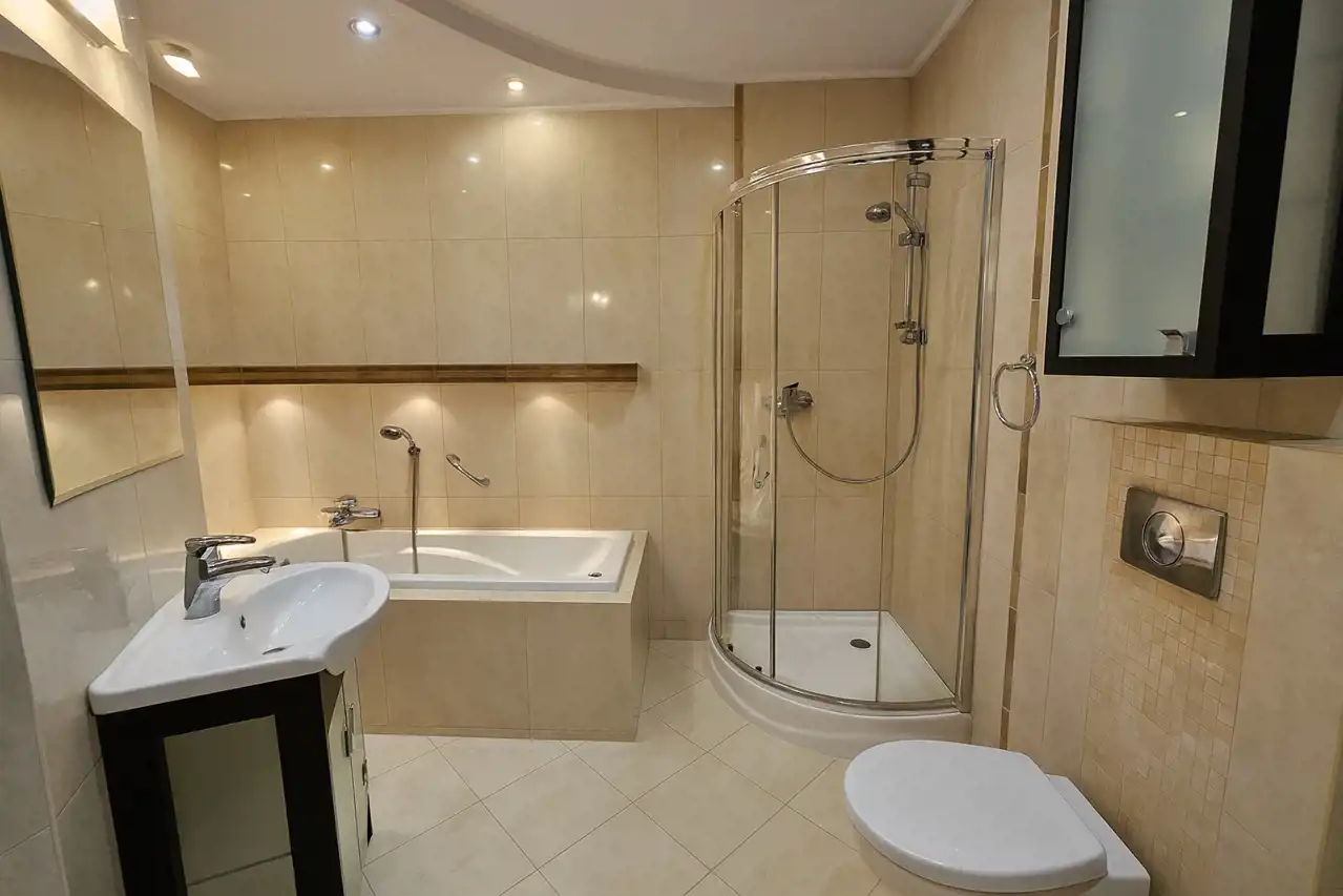 Wanna z hydromasażem, kabina prysznicowa, szafka z umywalką oraz nowa pralka przystosowana do zabudowy. -