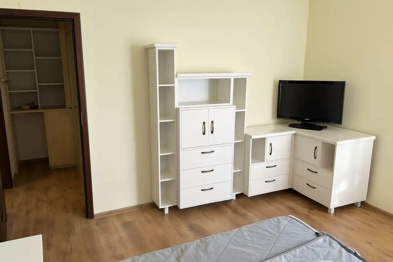 Komfortowa przestrzeń prywatna lub pokój dziecka; zabudowa meblowa oraz telewizor. -