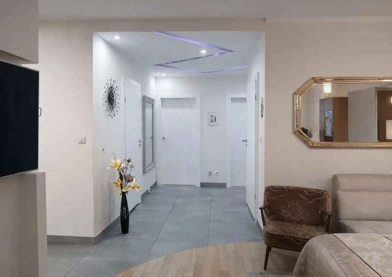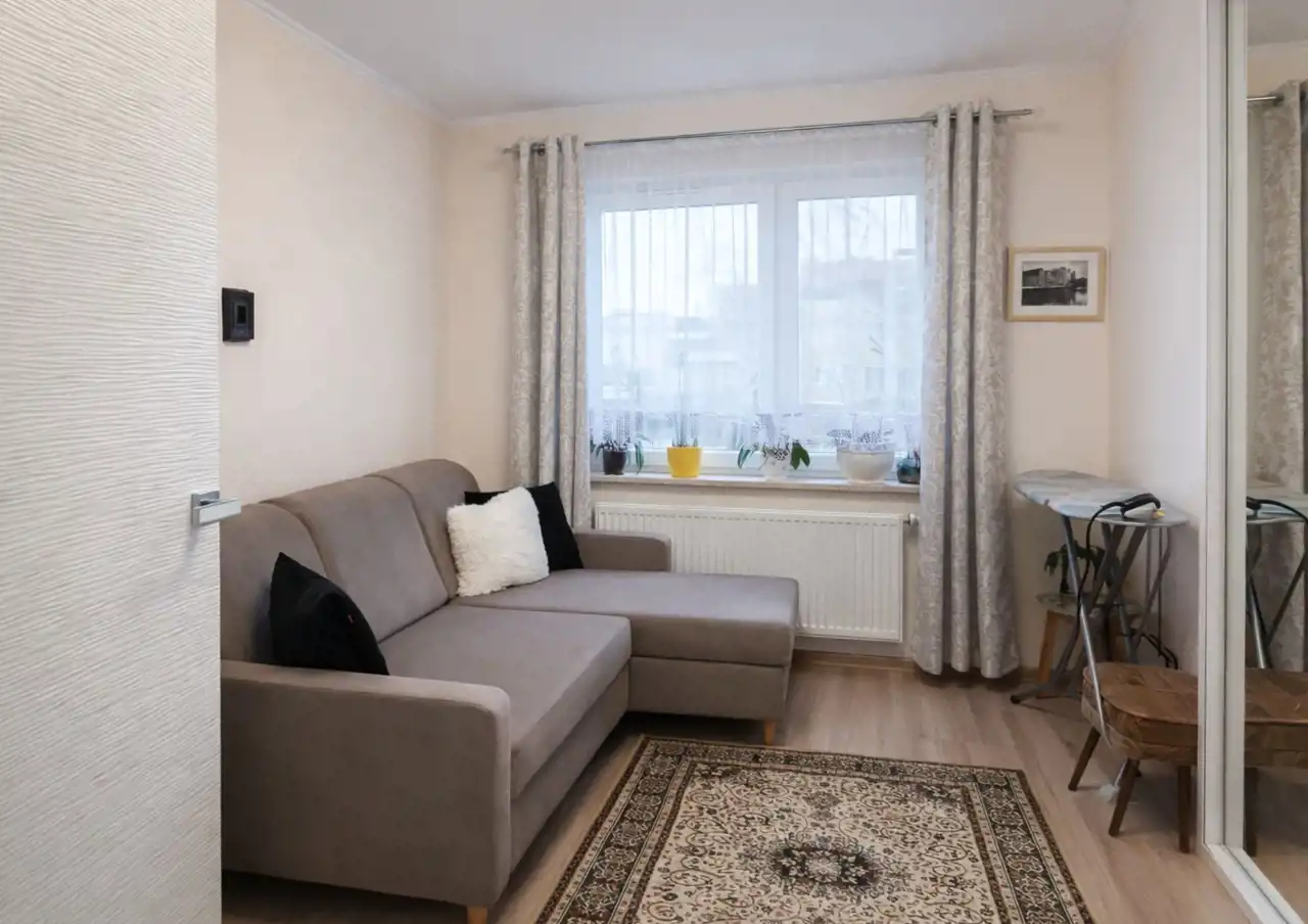 • jasny salon z wyjściem na balkon – idealne miejsce do odpoczynku