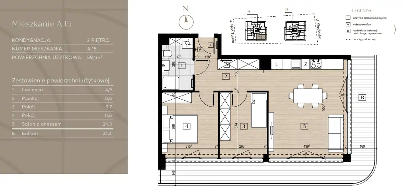 - Charakterystyka mieszkania 59.1 m2, 3 pokoje