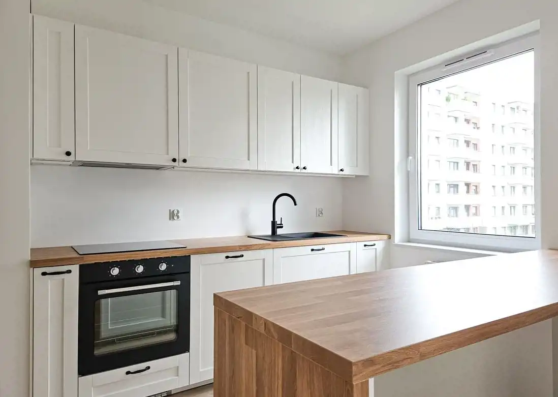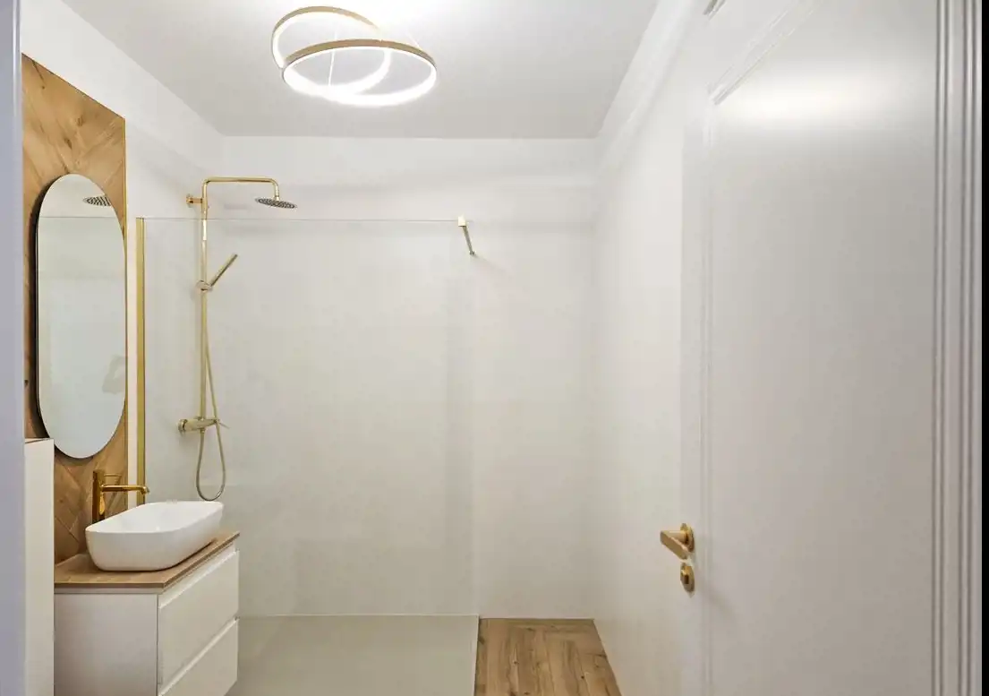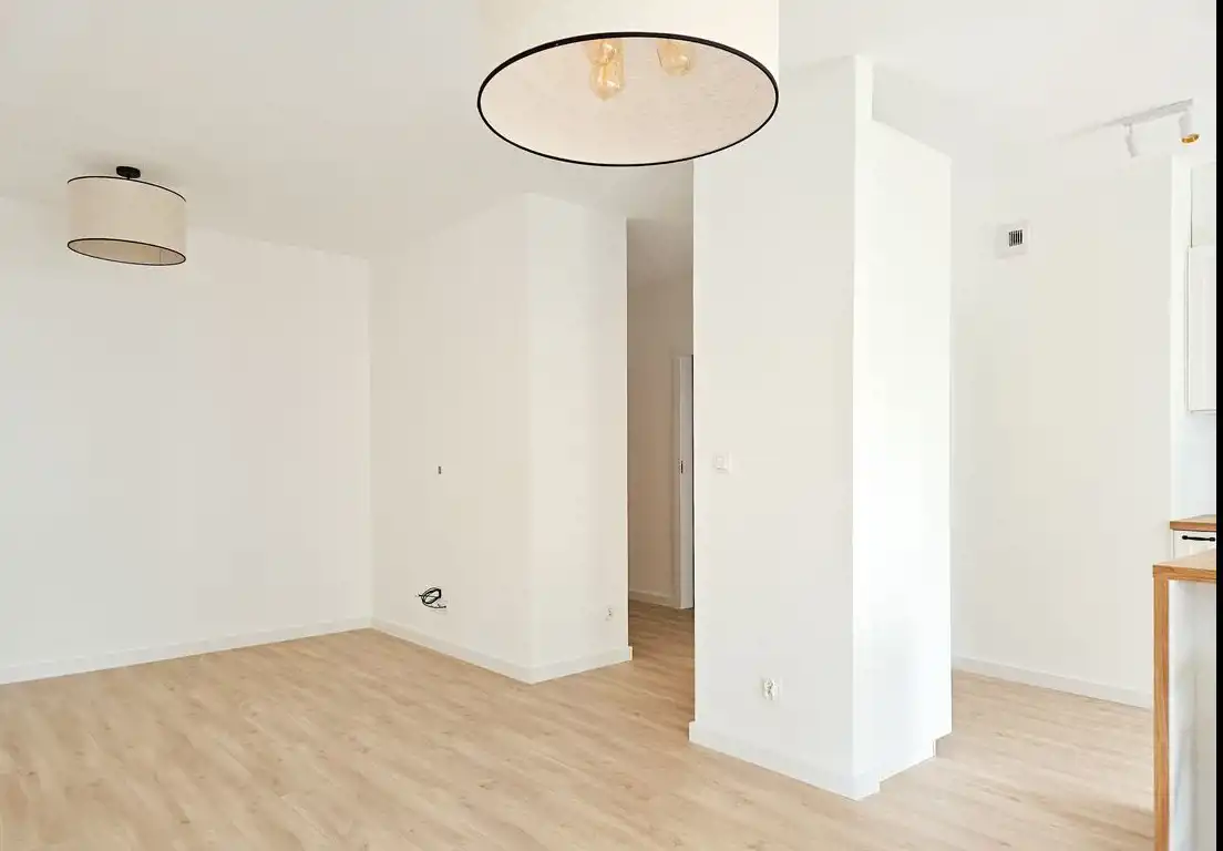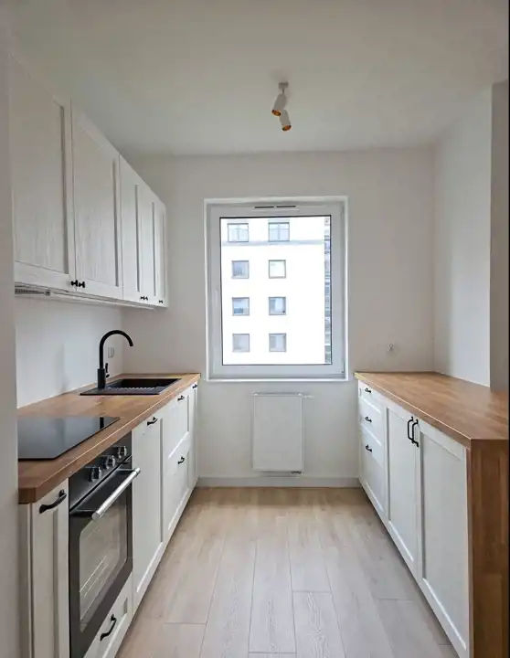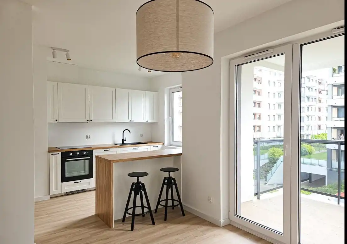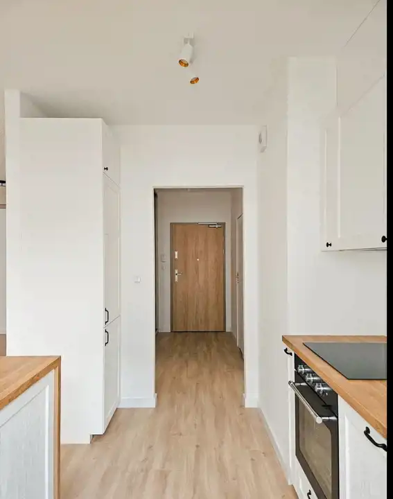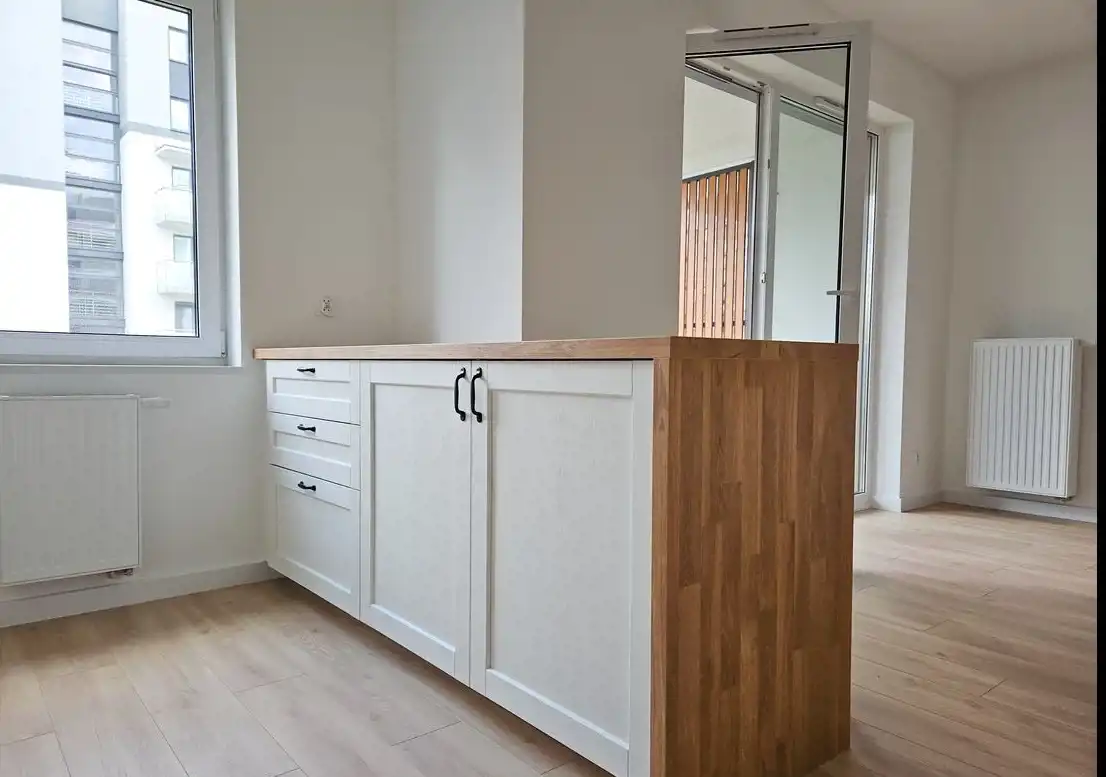 Nowocześnie urządzona kuchnia w kolorze białym z drewnianym blatem, wyposażona jest w sprzęt AGD (piekarnik, płyta indukcyjna, okap, lodówko-zamrażarka, zmywarka) doskonale komponuje się z otwartym salonem. Podłogi w mieszkaniu są w jednolitym drewnianym kolorze. Mieszkanie jest jasne, przestronne, ma duże okna gwarantujące mnóstwo światła. Mieszkanie znajduje się na zamkniętym osiedlu. Budynek wyposażony jest w cichobieżną windę z poziomu garażu, klatki schodowe wykończone wysokiej jakości materiałami.