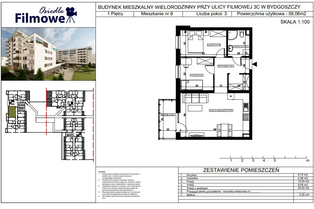 Oferta dotyczy mieszkania znajdującego się w budynku przy ul. Filmowej 3C. Budynek wyróżnia się kaskadową formą — w najwyższym punkcie posiada 8 kondygnacji, natomiast druga część jest niższa i obejmuje 4 piętra. W całym obiekcie znajduje się łącznie 75 mieszkań.