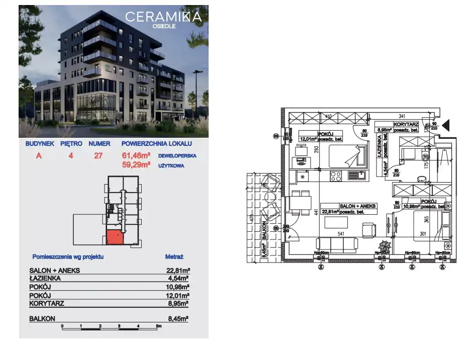 Prezentowane 3-pokojowe mieszkanie na 4 piętrze o metrażu 59,29 m2 zawiera: