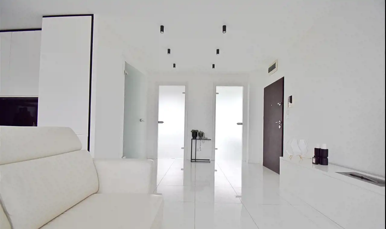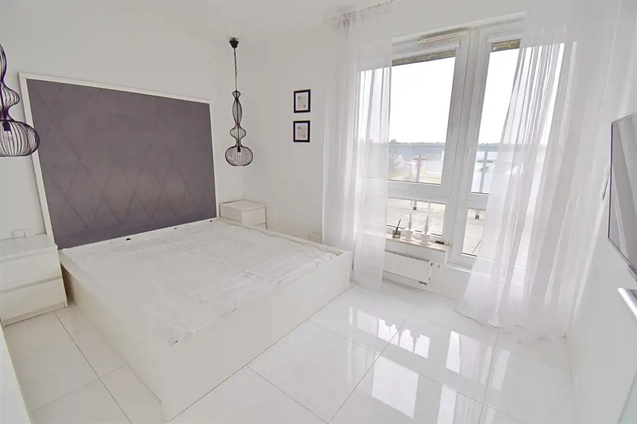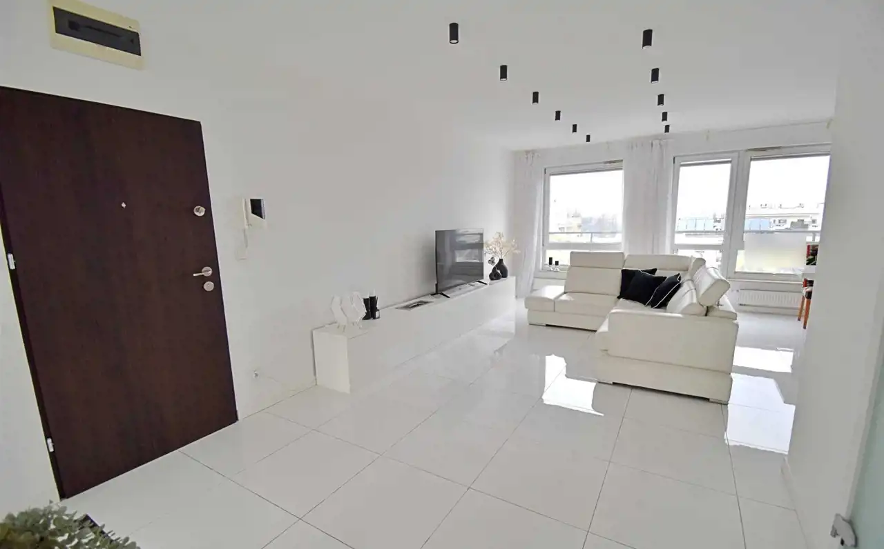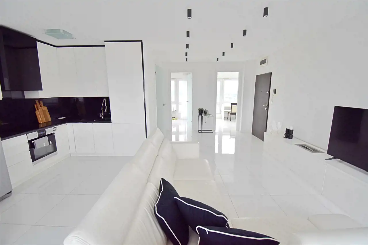 Wnętrze w stylu nowoczesnym, bardzo jasne i przestronne. Ogromne okna w każdym pomieszczeniu. Wyjście na taras z obu sypialni niezależnie. W jednej z sypialni duża, pojemna garderoba z półkami i wieszakami oraz duża szafa przesuwna. Wszystkie drzwi w mieszkaniu o podwyższonej wysokości wykonane z mrożonego szkła. Łazienka z dużym prysznicem. Zarówno meble jak i podłoga w kolorze białym "na wysoki połysk", biała skórzana kanapa wysokiej jakości.