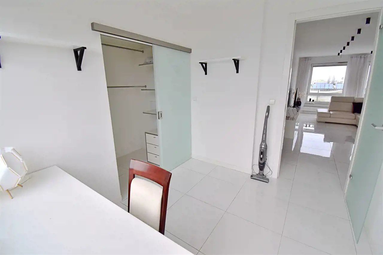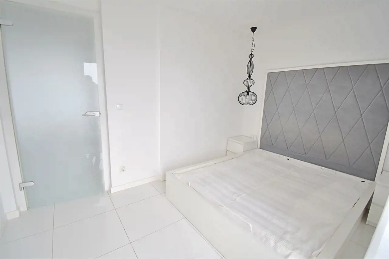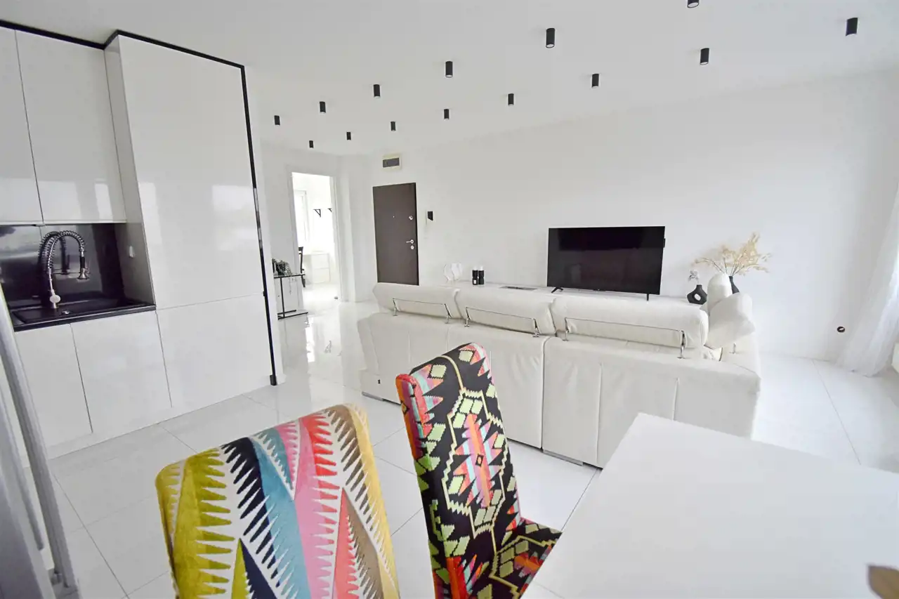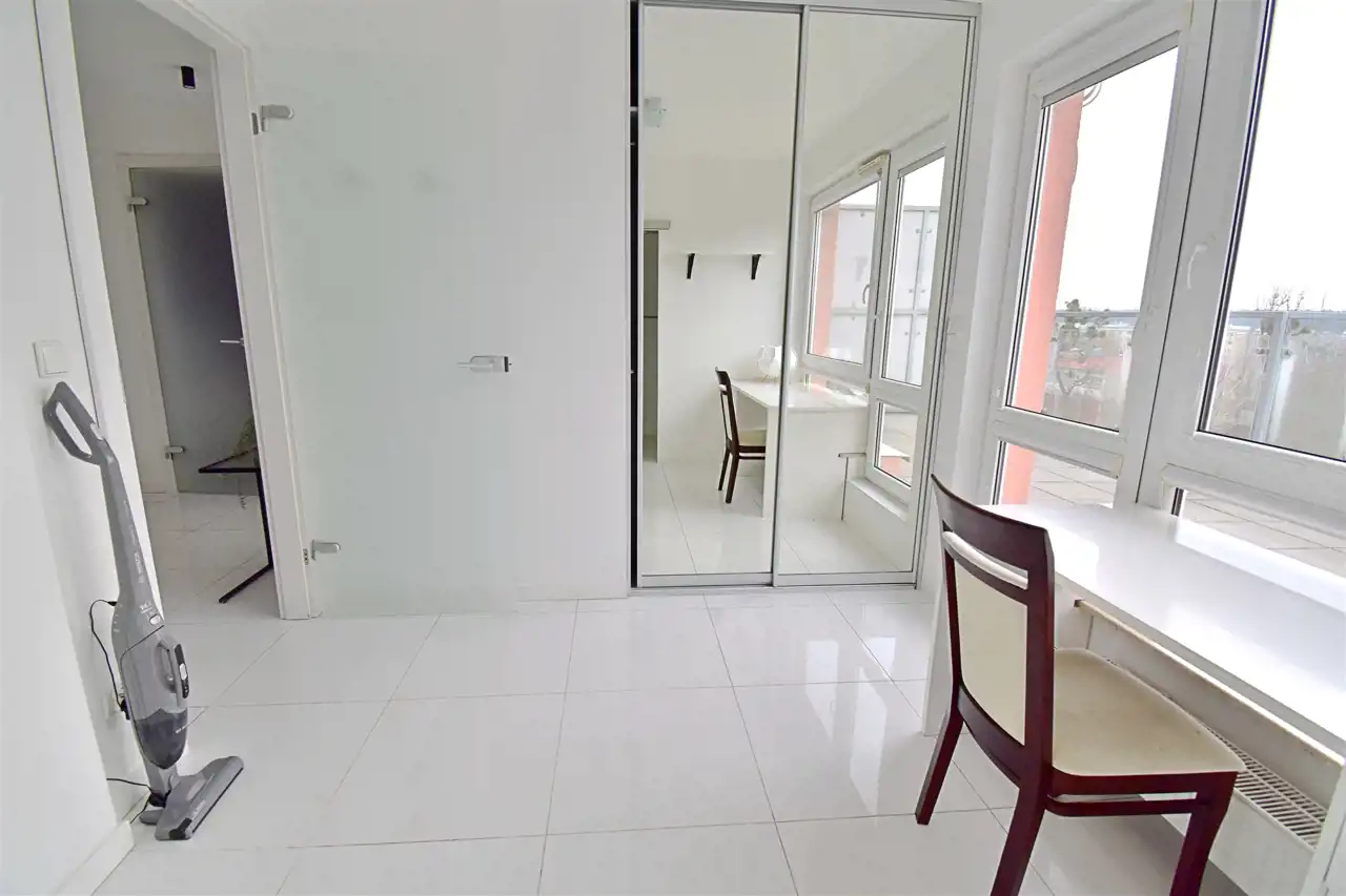 Wnętrze w stylu nowoczesnym, bardzo jasne i przestronne. Ogromne okna w każdym pomieszczeniu. Wyjście na taras z obu sypialni niezależnie. W jednej z sypialni duża, pojemna garderoba z półkami i wieszakami oraz duża szafa przesuwna. Wszystkie drzwi w mieszkaniu o podwyższonej wysokości wykonane z mrożonego szkła. Łazienka z dużym prysznicem. Zarówno meble jak i podłoga w kolorze białym "na wysoki połysk", biała skórzana kanapa wysokiej jakości.