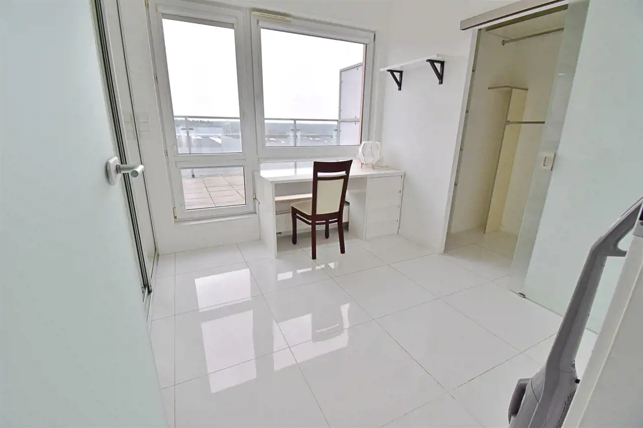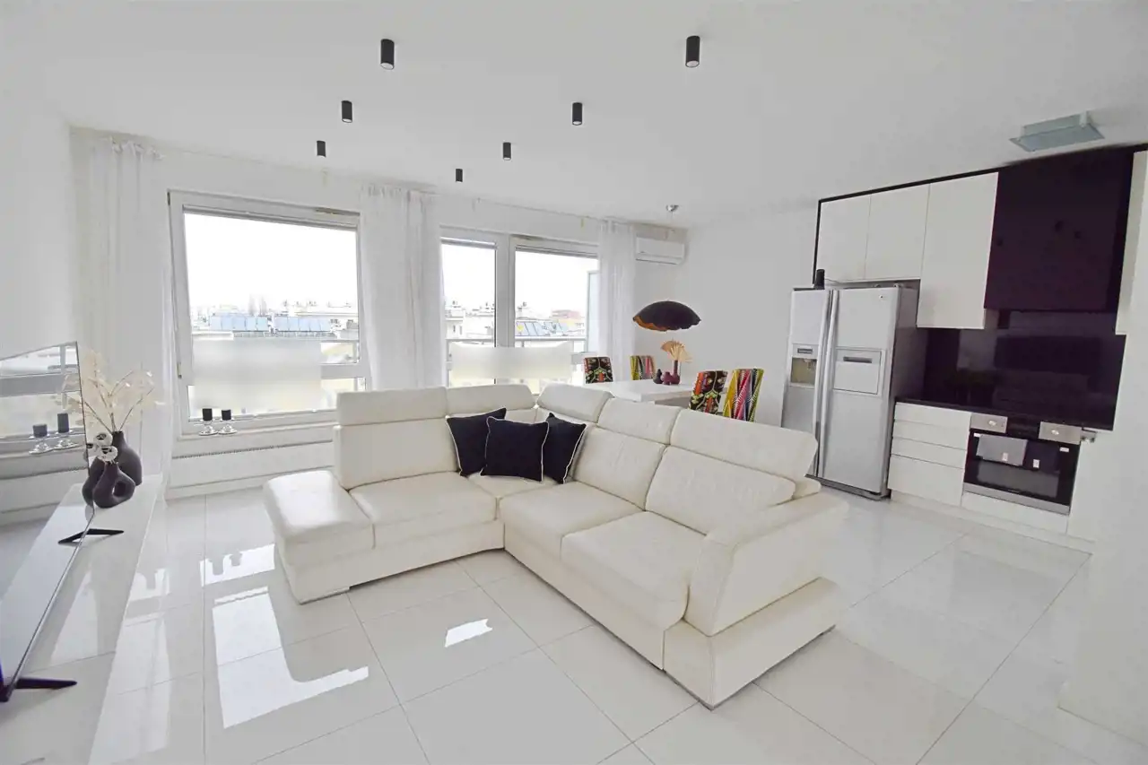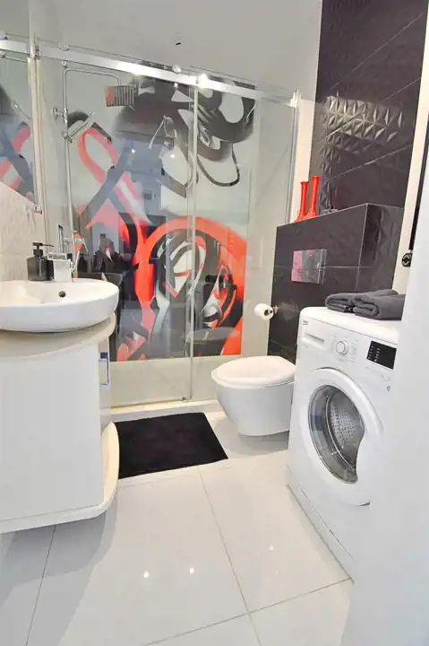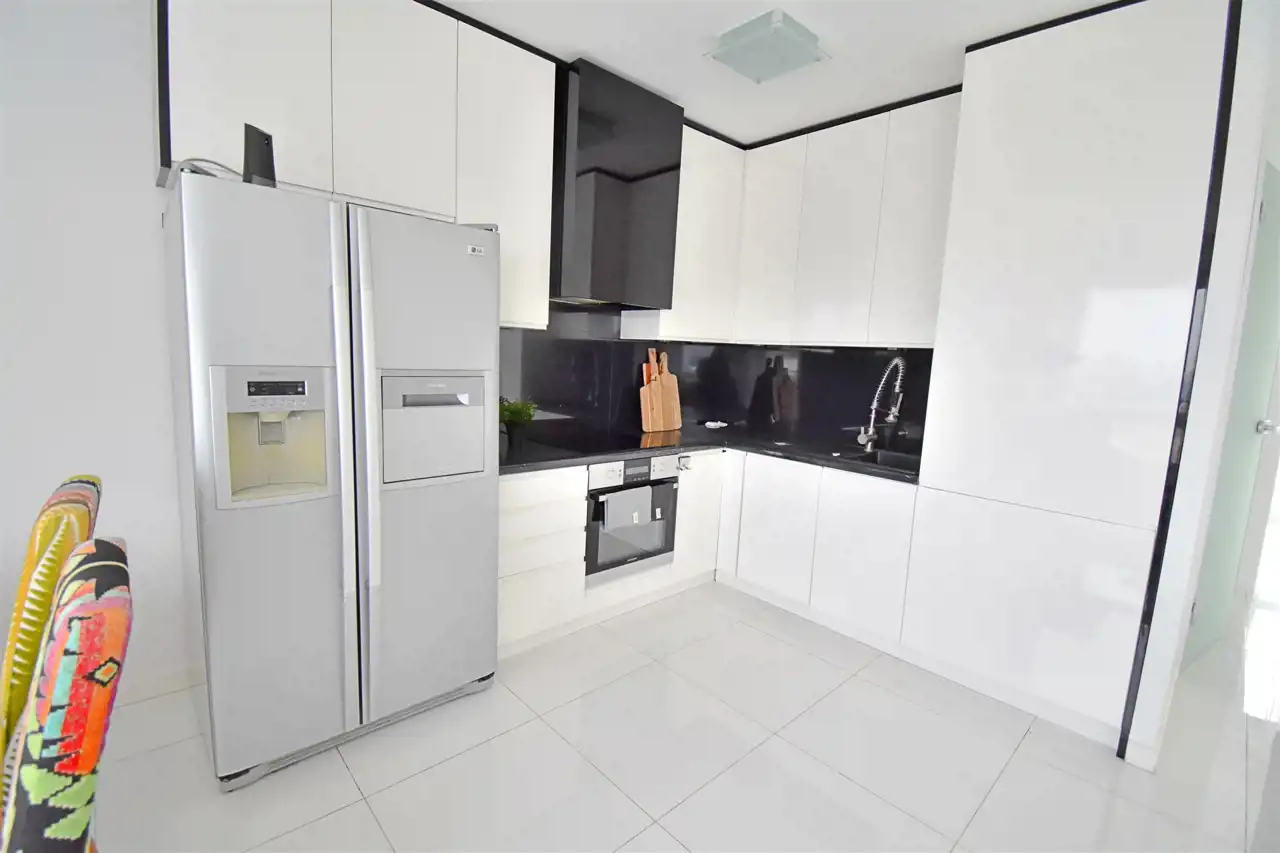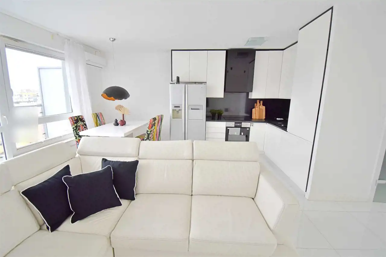 Wnętrze w stylu nowoczesnym, bardzo jasne i przestronne. Ogromne okna w każdym pomieszczeniu. Wyjście na taras z obu sypialni niezależnie. W jednej z sypialni duża, pojemna garderoba z półkami i wieszakami oraz duża szafa przesuwna. Wszystkie drzwi w mieszkaniu o podwyższonej wysokości wykonane z mrożonego szkła. Łazienka z dużym prysznicem. Zarówno meble jak i podłoga w kolorze białym "na wysoki połysk", biała skórzana kanapa wysokiej jakości.