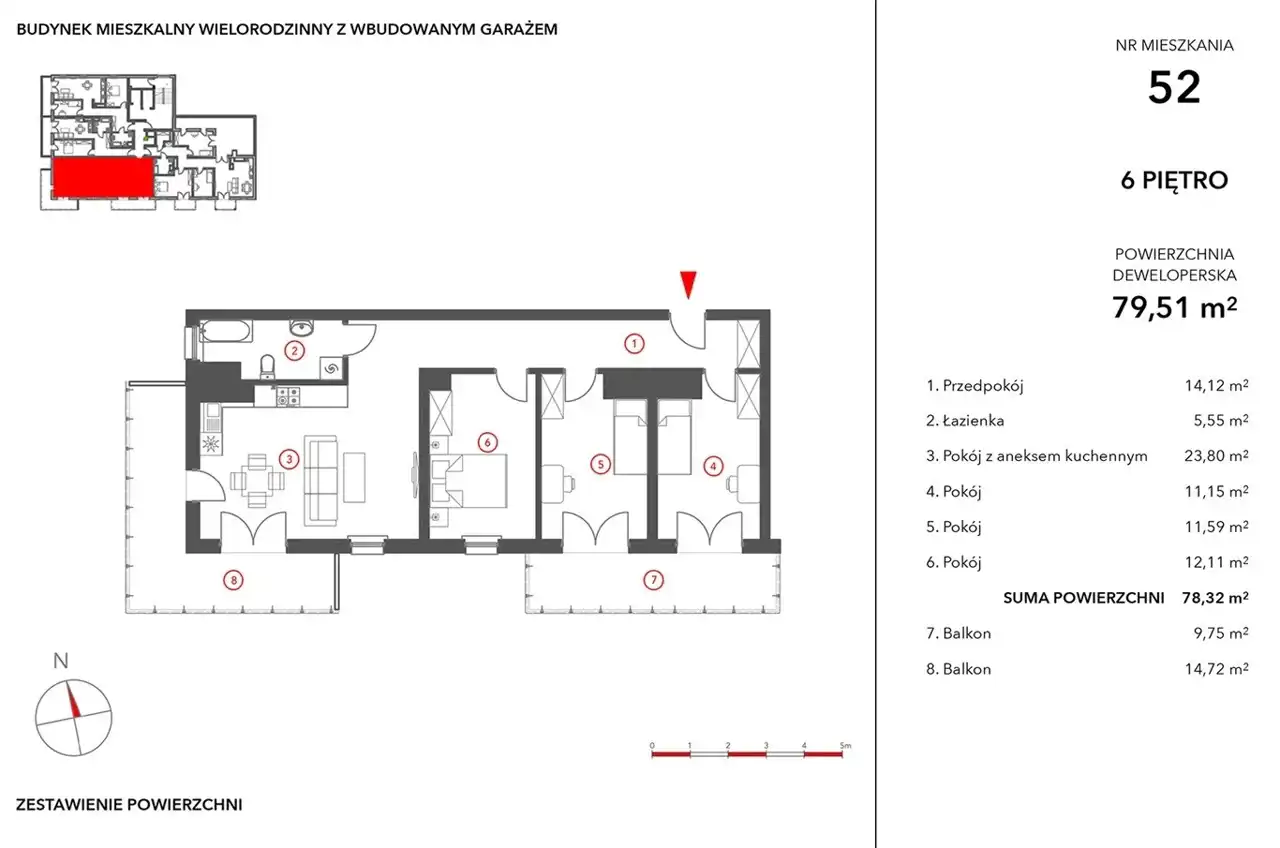 - pokoju z aneksem kuchennym (23,8m2) z wyjściem na duży balkon (14,72m2);