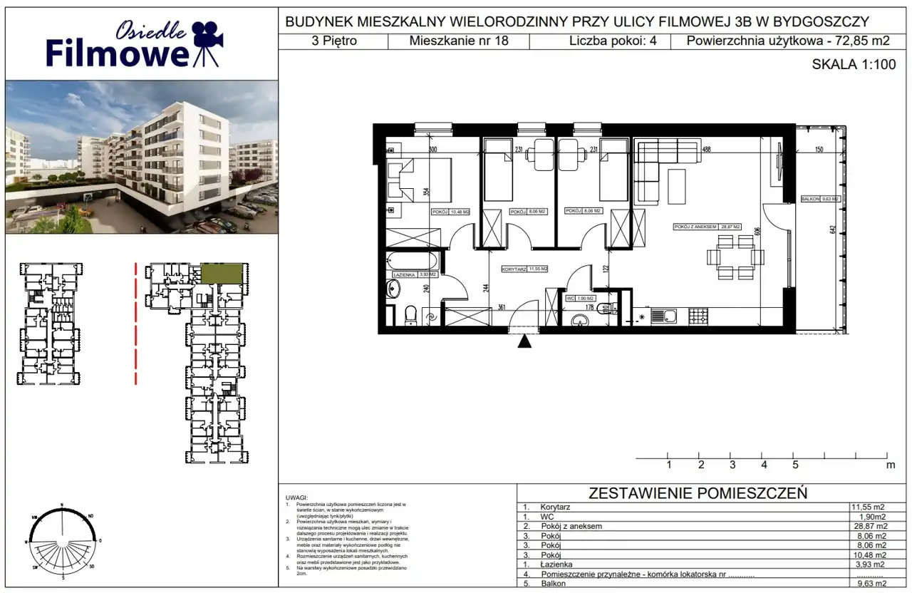 Mieszkanie o pow. 72,85 m2 składa się z :