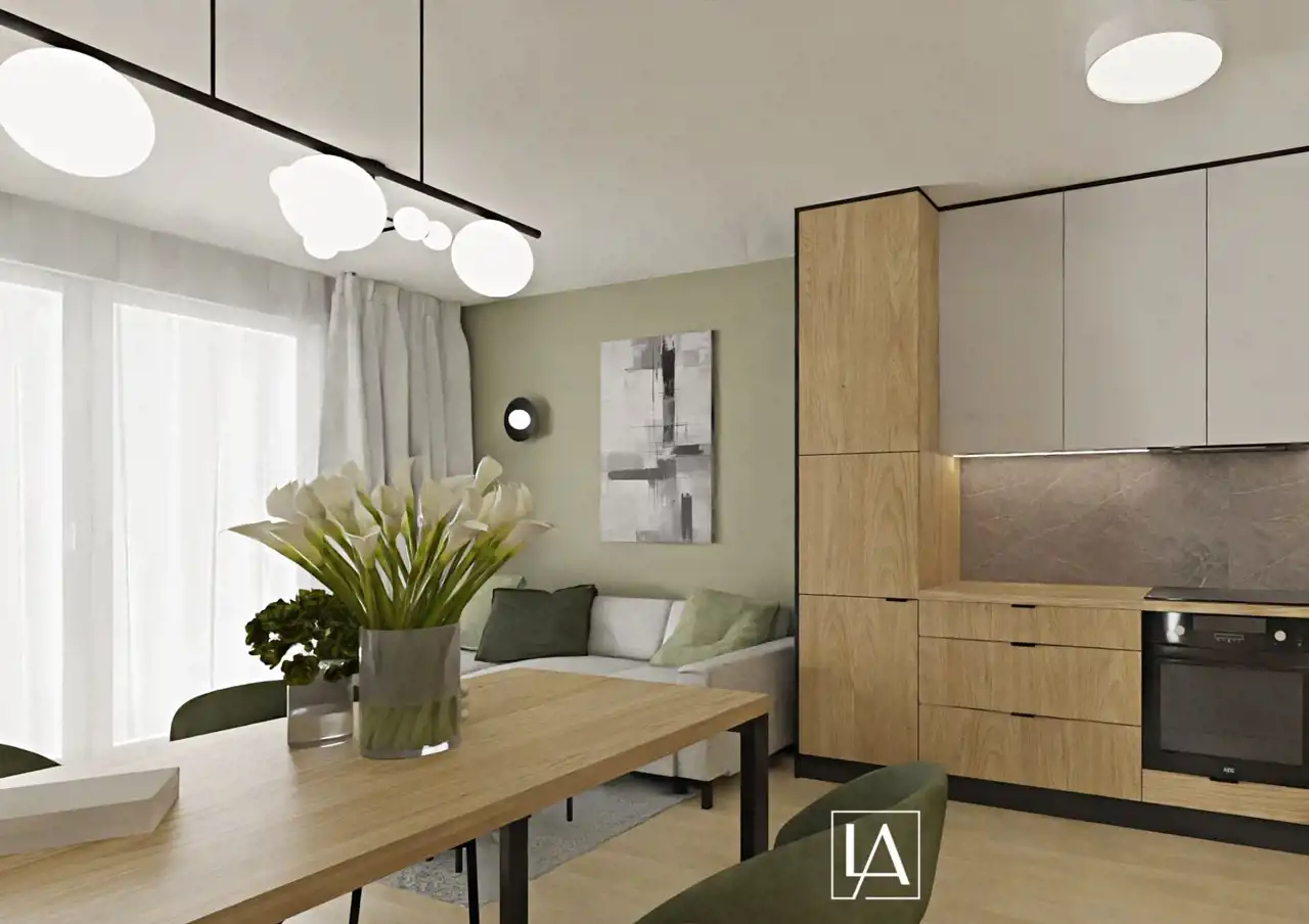 Przestronny salon z aneksem kuchennym – idealny do wspólnego spędzania czasu, dobrze doświetlony dzięki dużym przeszkleniom.