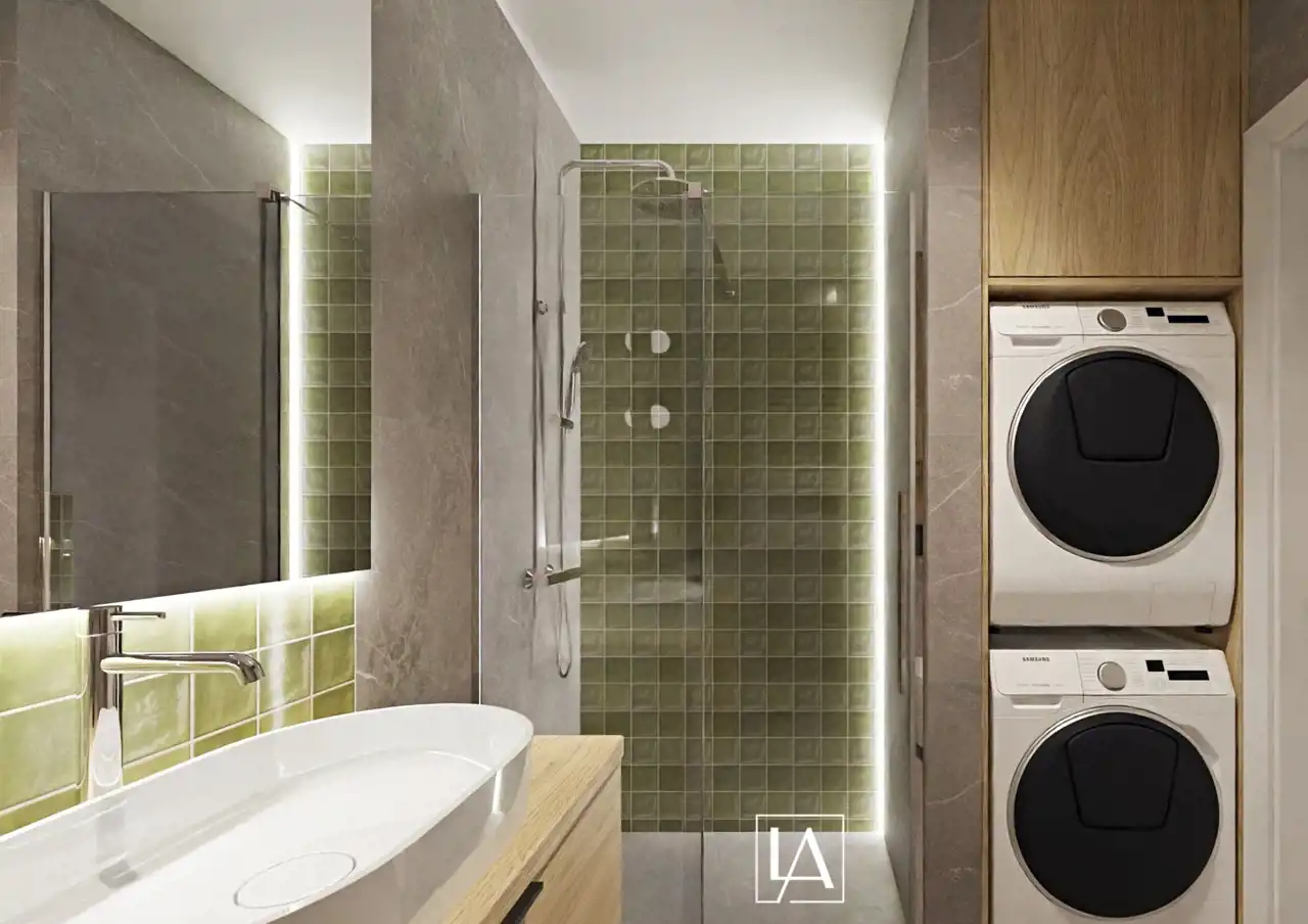 Nowoczesna łazienka – przygotowana pod zabudowę z miejscem na pralkę i funkcjonalną armaturą.