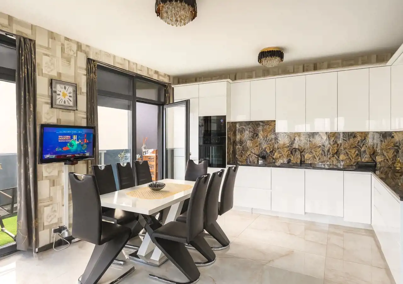 Kuchnia – elegancka zabudowa meblowa wraz z kompletnym sprzętem AGD: piekarnik, płyta indukcyjna, mikrofalówka, okap, zmywarka oraz lodówka.