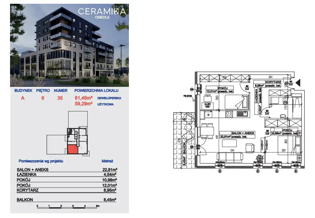 - Charakterystyka mieszkania 59.42 m2, 3 pokoje