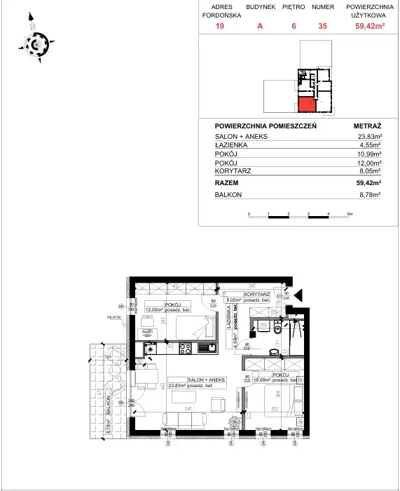 - Charakterystyka mieszkania 59.42 m2, 3 pokoje