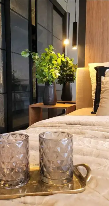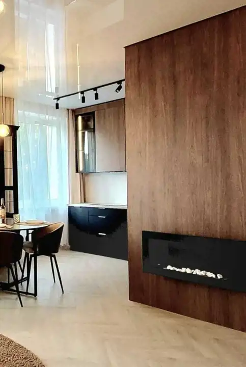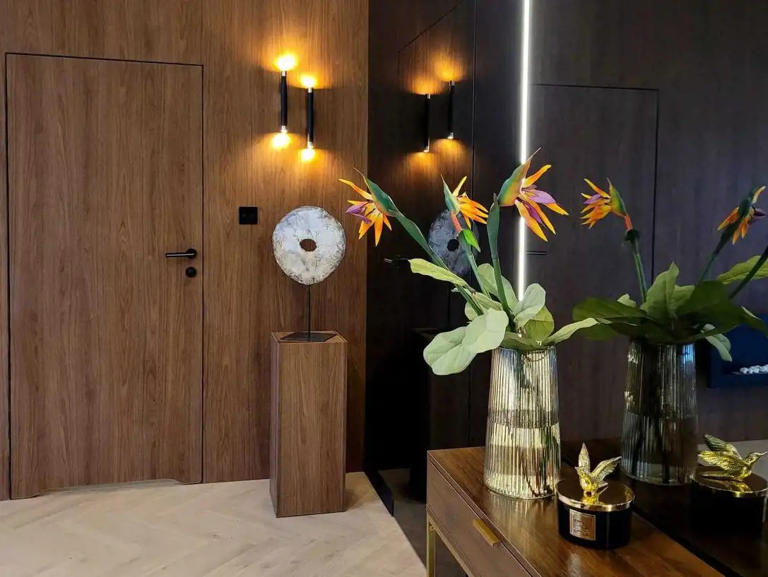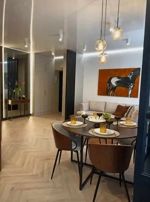 Całe mieszkanie zostało urządzone spójnie i elegancko: napinane sufity dodające lekkości i nowoczesnego charakteru, stylowe oświetlenie, częściowo sterowane pilotem, wysokiej jakości materiały wykończeniowe,