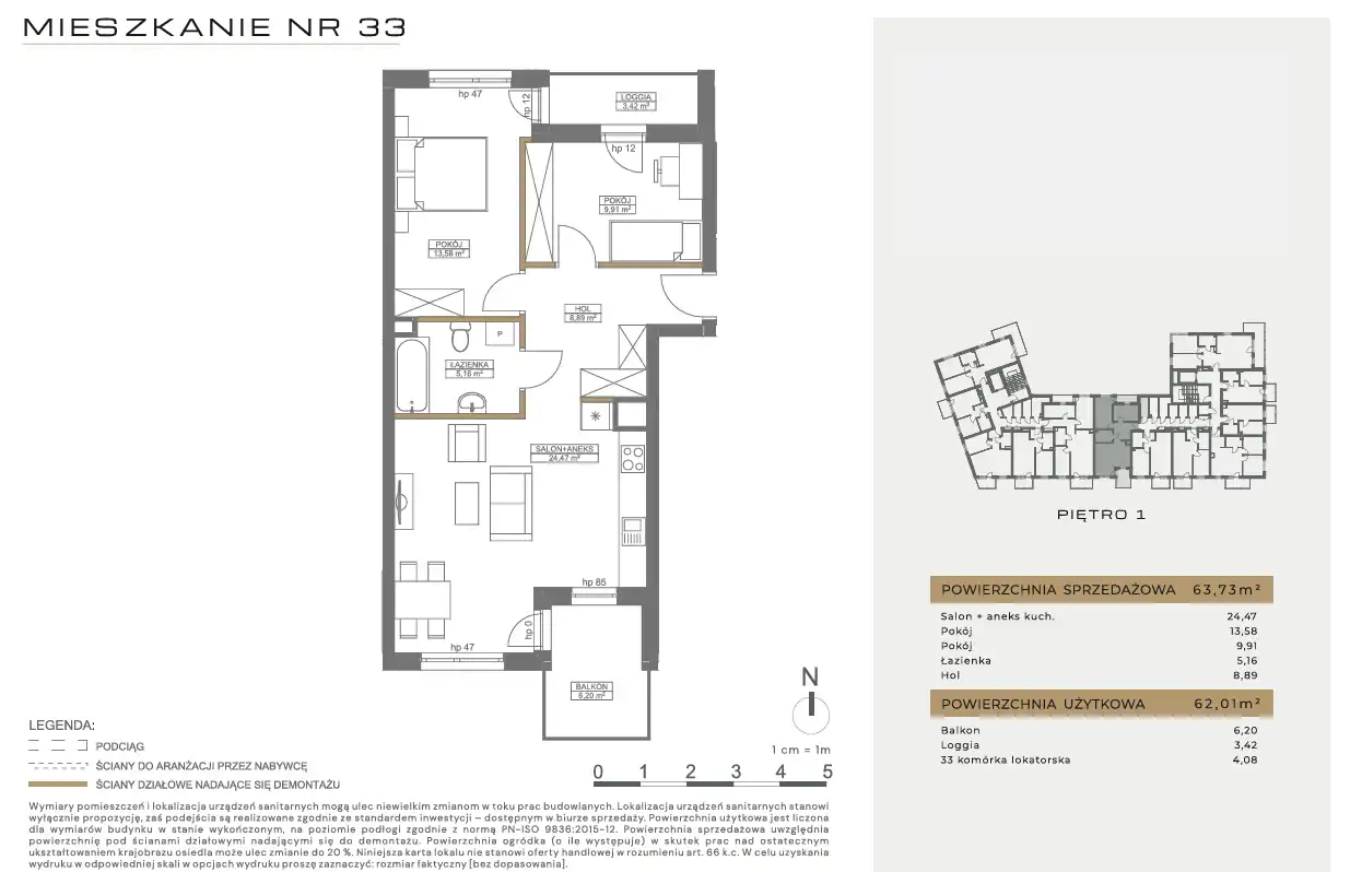 - Charakterystyka mieszkania 63.73 m2, 3 pokoje