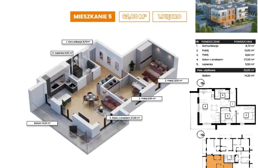 - Charakterystyka mieszkania 62.59 m2, 3 pokoje