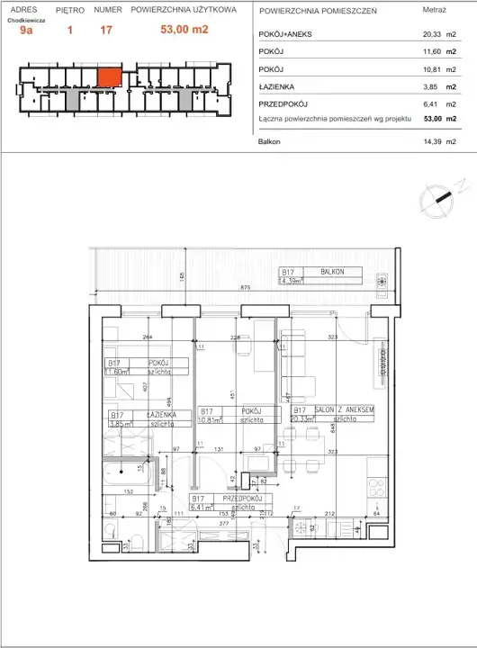 Powierzchnia użytkowa o metrażu 53,00 m² obejmuje: