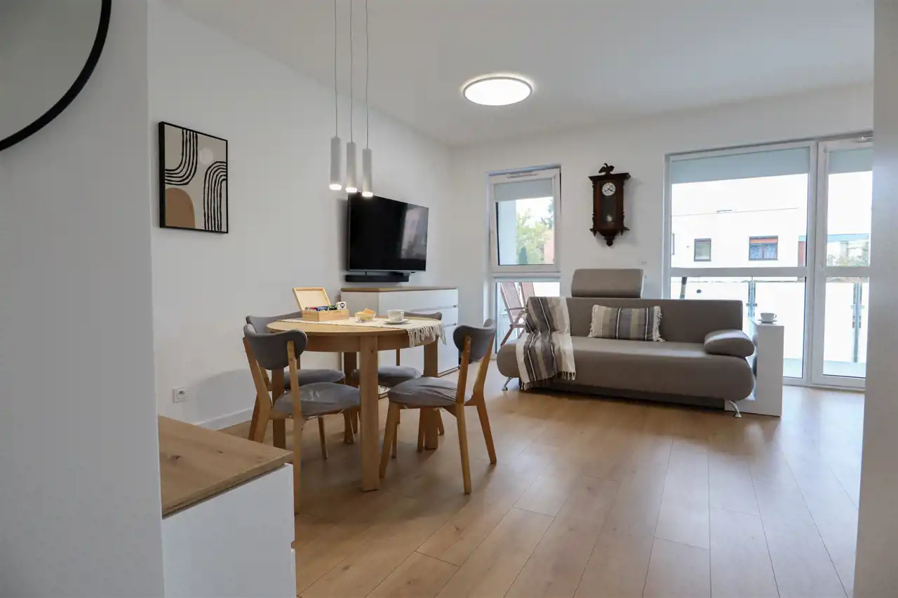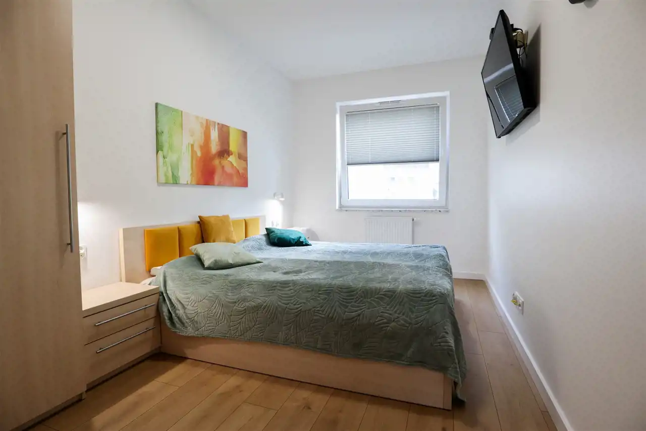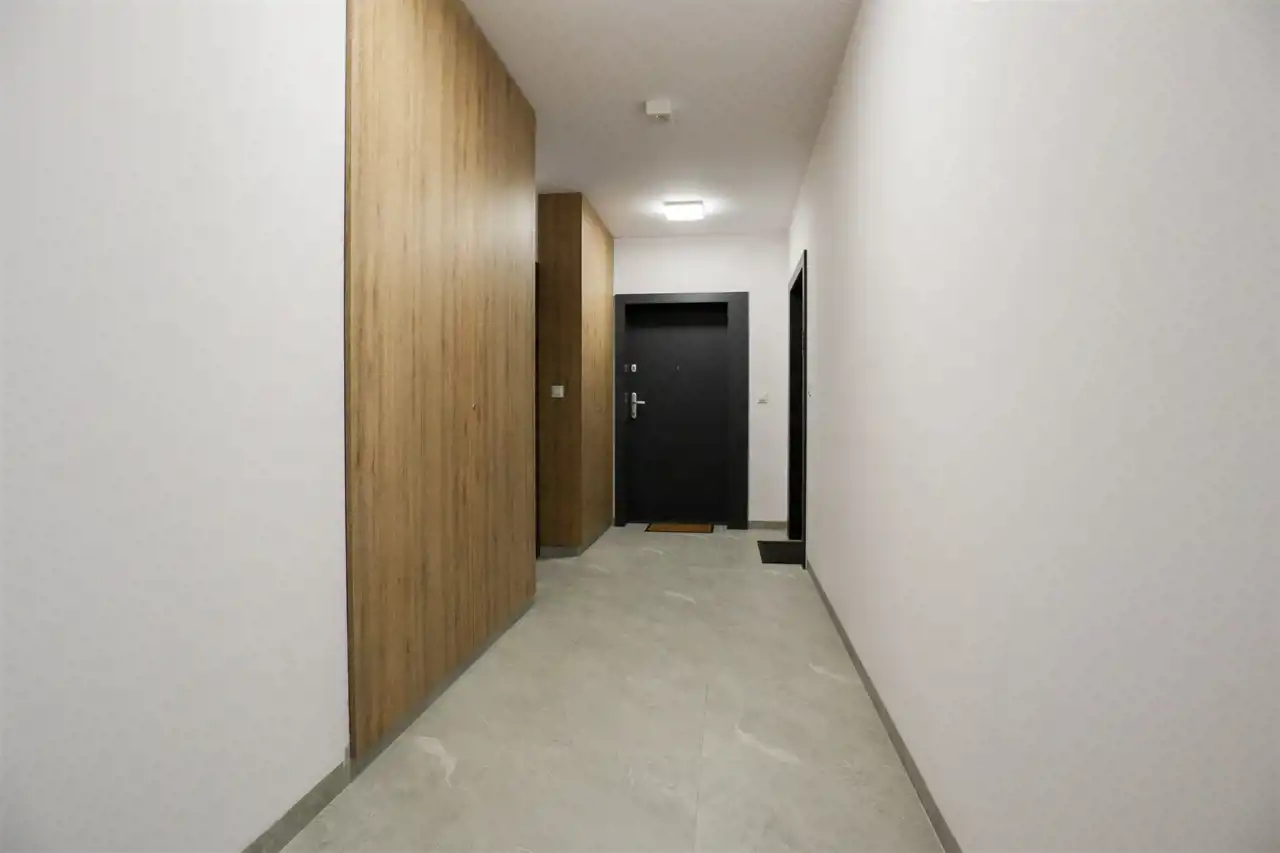 przestronny salon z nowoczesnym aneksem kuchennym (24 m²) zachwyca jasnością i przestrzenią, a duże okna prowadzą na imponujący balkon (9 m²) o zachodniej ekspozycji, idealny na popołudniowy odpoczynek w promieniach słońca. Sypialnia (12 m²) została wyposażona w praktyczne szafy w zabudowie, które dodają elegancji i funkcjonalności, a piękna łazienka urządzona w nowoczesnym stylu oferuje nie tylko komfort, ale i wiele sprytnie ukrytych schowków. Całość dopełnia ustawny przedpokój.