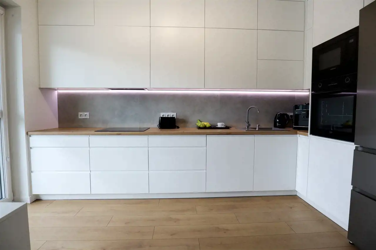 Mieszkanie jest urządzone w spójnej stylistyce – jednolita podłoga, biel ścian i ogromne okna sprawiają, że przestrzeń jest jasna, przytulna i ponadczasowa.